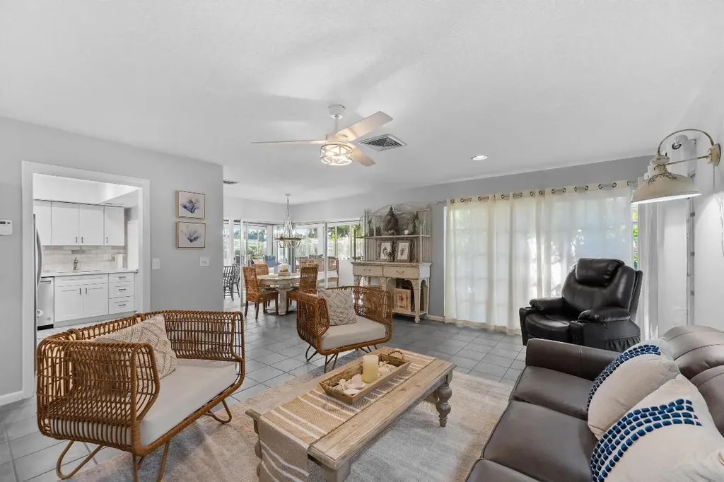 Renovated Villa! Kitchen with new cabinets, quartz countertops, and tile backsplash. Freshly painted, designer light fixtures, restored tile, new LVP flooring, and more! Spacious 2 bedroom, each with huge walk-in closets, one with ensuite bathroom with new quartz countertops. The other bedroom has a full bath nearby. Open floorplan with foyer, living room, kitchen, and dining room. The cooled/heated Florida room has new LVP flooring, and includes 2 daybeds for sitting or sleeping more guests, eat-at counter, and a 2nd dining/game area. 2 car attached carport! Best of all this Villa is being sold fully furnished, including all appliances, and Home Decor! Bring your personal items and move right in!