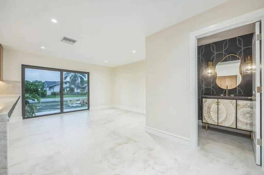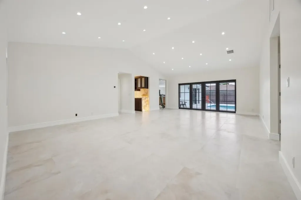 The open-concept family room connects seamlessly to the pool patio and yard, with a full cabana-style bathroom offering easy access from outside perfect for pool days and entertaining. A private, light-filled home office sits just off the foyer, ideal for working from home. The laundry room includes custom storage, quartzite counters, washer, dryer, and a utility sink.