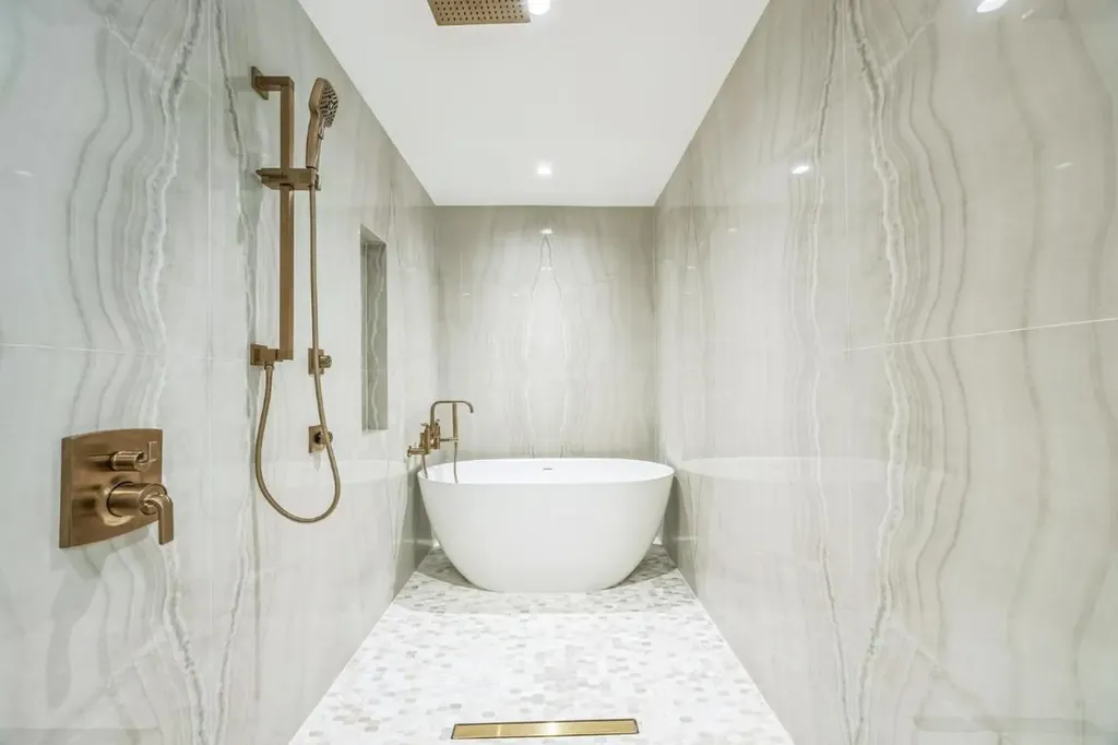 " A luxurious master bath with double vanities, freestanding soaking tub, oversized shower, and beautifully appointed wet room