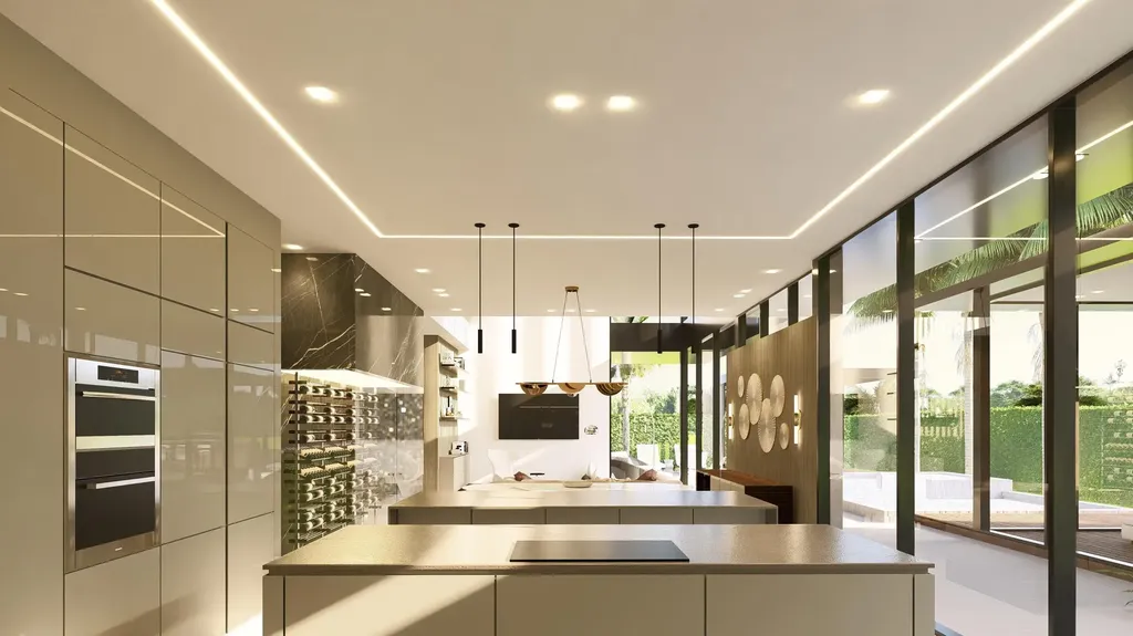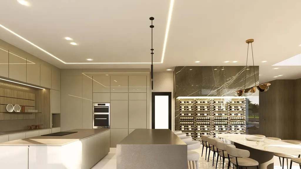 At the heart of the home lies the two-island kitchen, a culinary connoisseur's dream. Outfitted with SubZero and Wolf appliances, including a natural gas cooktop, and adorned with exquisite materials, this space is as functional as it is stylish, equally suited for intimate family gatherings and grand-scale entertaining. The kitchen is further enhanced by a concealed pantry, featuring a prep area with its own sink, additional dishwasher, and ample countertop space for all your culinary needs.