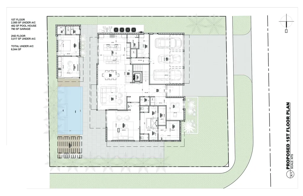 The estate's lushly landscaped backyard is a tranquil haven. Positioned on a corner lot, it offers enhanced seclusion and ample space for an outdoor retreat of the highest caliber. A shimmering pool serves as the centerpiece, framed by a guest house on one side and a pergola-shaded summer kitchen on the other. The front yard, meticulously hedged, fully fenced, and driveway-gated, offers an additional layer of privacy and security, ensuring peace of mind.