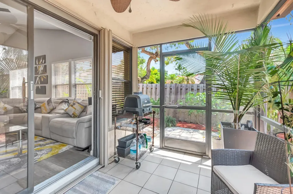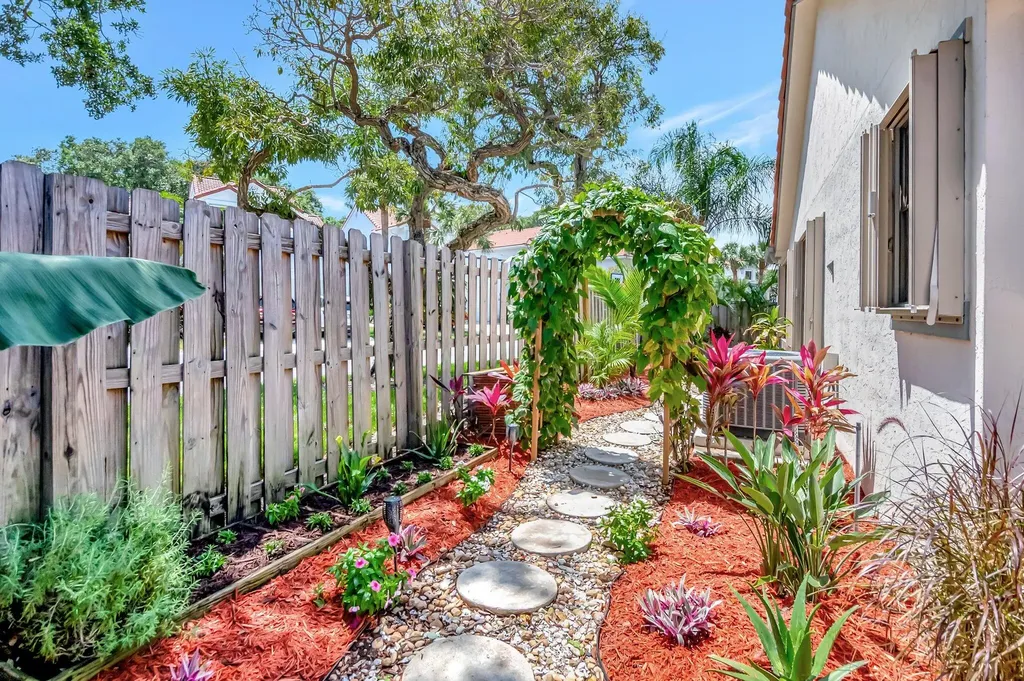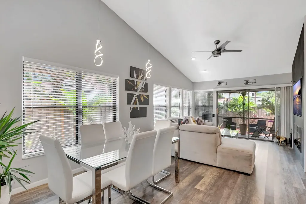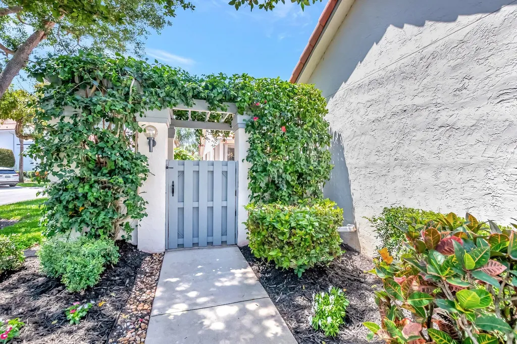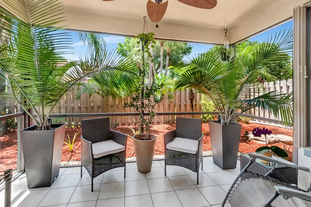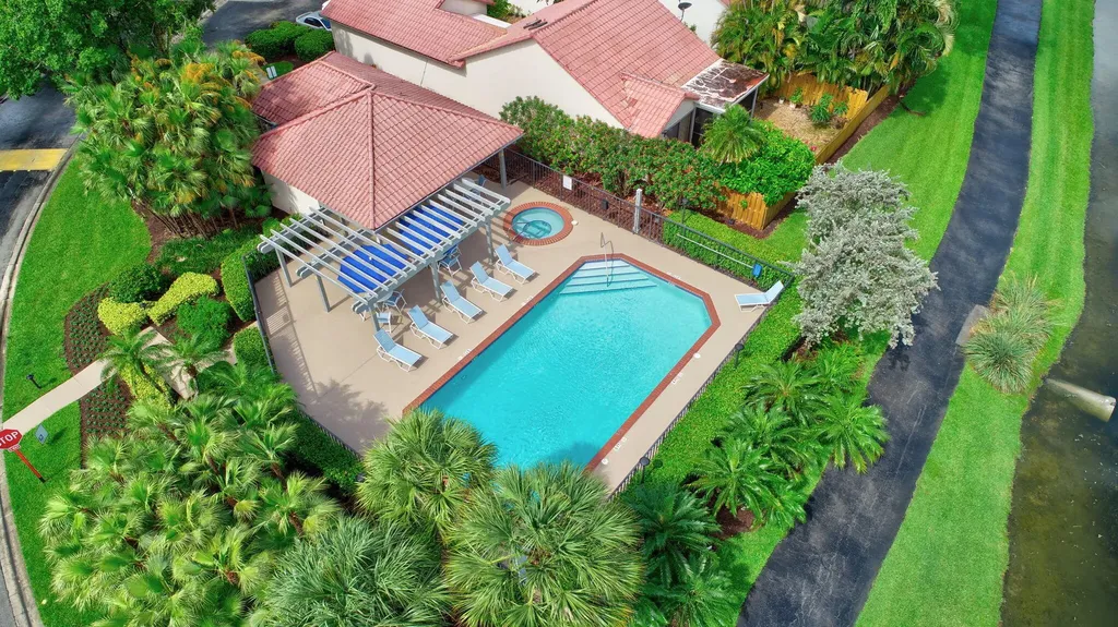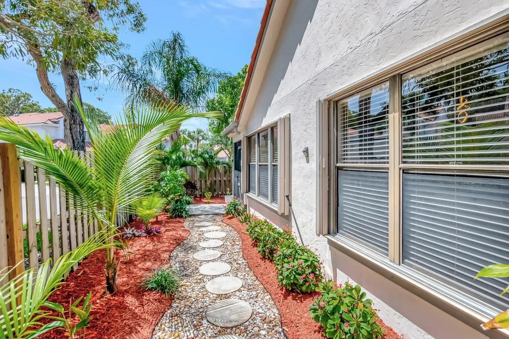 RARELY AVAILABLE! Immaculately Kept & NY Contractor Owned 2/2 SFH Nestled in a Tropical Paradise with No Rear Neighbors! Experience the Peace and Tranquility of this Light & Bright Contemporary Residence on 1 level, with a Vaulted Ceiling, Updated Kitchen & Bathrooms, Large Bedrooms, Custom Closets, & Brand New (2025) A/C. Lush Landscaping and being Situated on a Corner Lot with Open Space on One Side create the Experience of Total Privacy. Other features include a spacious 2 Car Garage, Washer/Dryer inside, Newer Appliances, Recently installed flooring in the Living Areas and dual zoned sprinkler system. Wimbledon is Centrally Located w/24 hr. Man Gated Security, Community Heated Pool & Hot Tub, and HotWire Cable and High Speed Internet (included in maintenance), close to everything!
