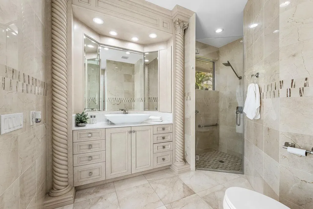 Best Value in St. Andrews Country Club! Discover unparalleled privacy and light filled interiors at this beautifully renovated estate, ideally located on nearly half an acre at the end of a quiet cul-de-sac street. This spacious 5 bedroom, 6 bathroom home offers unmatched serenity and grand scale with its soaring 20-foot ceilings, abundant natural light, and an inviting highly functional floor plan. **NO STEPS** The grand first-floor primary suite features dual bathrooms and walk-in closets, along with direct access to the pool and outdoor living space. 4 additional en-suite bedrooms are generously sized. The bright, white chef's kitchen is both functional and stylish--ideal for entertaining large groups or gatherings. Outside, the resort-style backyard features a fully equipped summer kitchen with Florida Room Dining, heated pool and spa, and a spacious yard ideal for children or pets. Additional highlights include a 3-car garage, 3 new A/C units, impact glass, and a whole-house generator for year-round comfort and peace of mind.