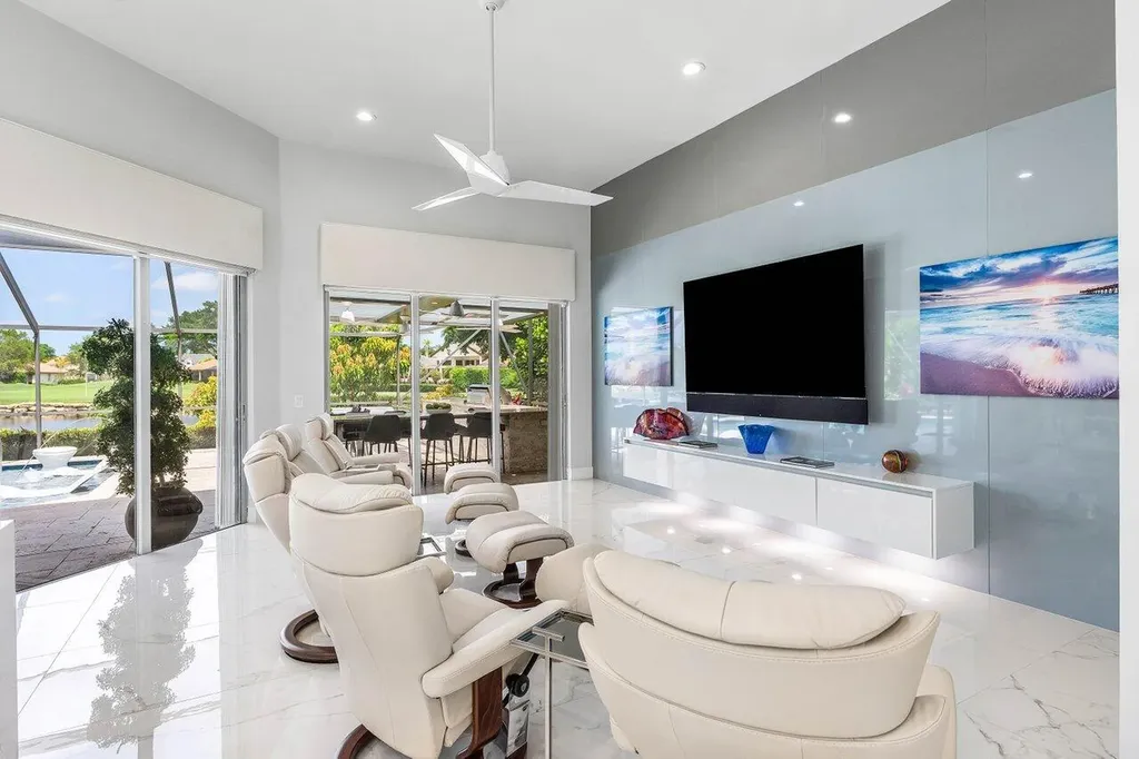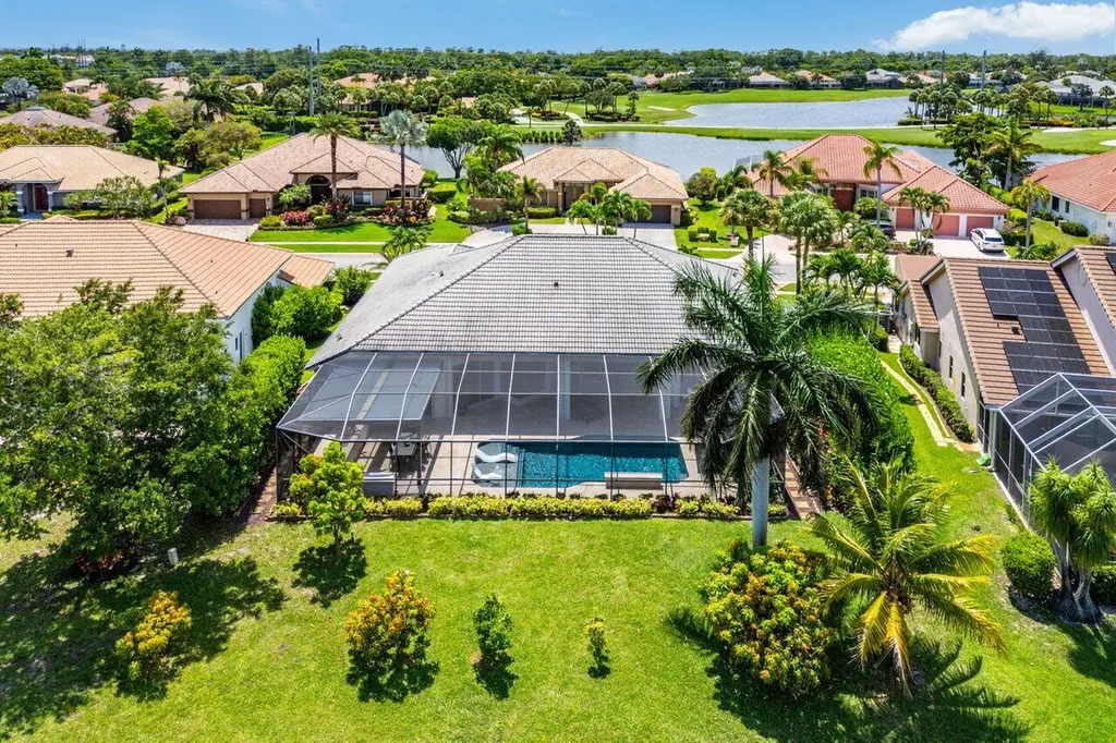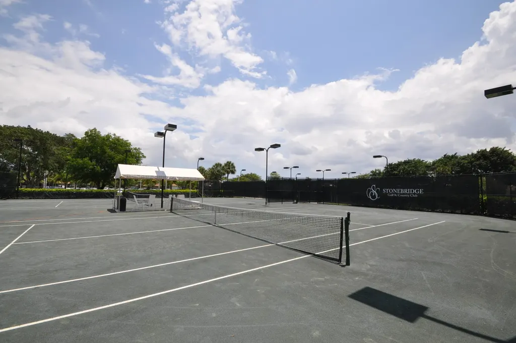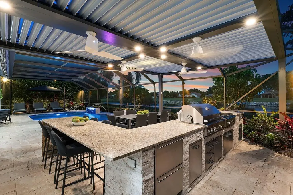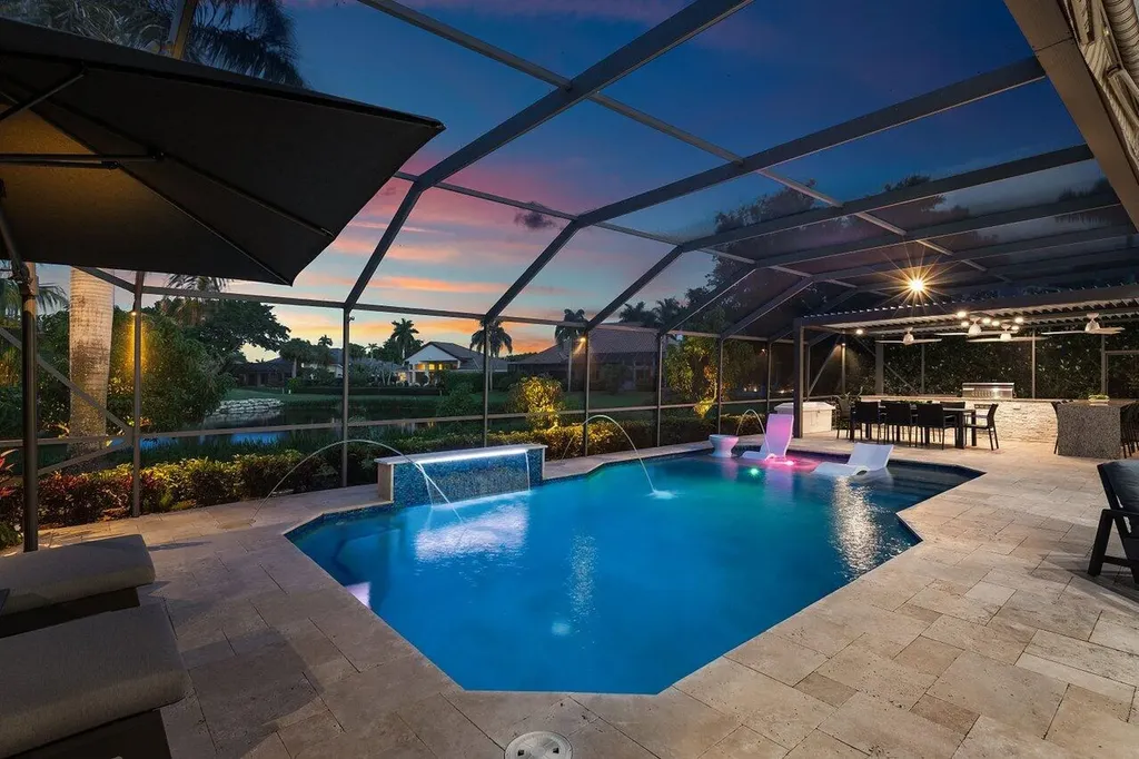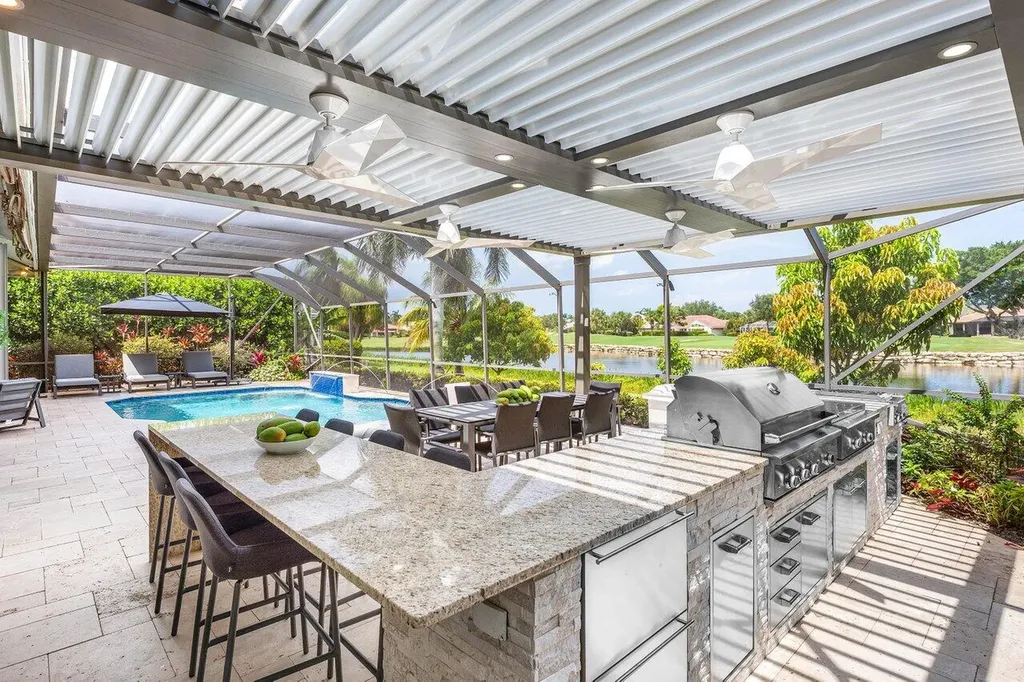 Welcome to this exquisitely renovated four-bedroom three bath luxury residence nestled in the heart of the sought-after Stonebridge Country Club. This is an opportunity to acquire a ''move-in, nothing needed'' home. Meticulously updated inside and out over the past two years ago with no expense spared, this elegant home blends timeless sophistication with modern comforts, offering the finest in South Florida living. From the moment you step inside, you're greeted by expansive living spaces adorned with designer porcelain tile flooring throughout. New custom cabinetry including floating cabinets with under lighting were installed in every room, providing the clean minimalist look awaiting your personal touch for accents. The outdoor kitchen features top-of-the-line built-in appliances, an oversized grill, Hibachi style griddle, separate countertop burner, refrigerator drawers, storage cabinet, and generous counter space, including a seating area with quartz countertop and waterfall edge. This area, and an associated dining area, are protected from the elements with a custom hurricane rated pergola with movable louvers which can be controlled via remotes or wired switch with an automatic closure function in the event of rain. The pergola contains integrated lighting and four ceiling fans, creating the ultimate space for alfresco dining and entertaining irrespective of the elements. The outdoor experience is complemented by a covered living area with ceiling fans and featuring a 75 inch Sunbrite television with audio system. A high end music system with overhead and rock speakers provides concert style audio over the entire area including the pool. The exterior is complemented by all new landscaping with landscape lighting, sidewalks and sprinkler system. Additional features include a whole-home generator, motorized blinds throughout the house, comprehensive whole house water purification system, new large-screen TV's with integrated sound systems in the master bedroom and family room, custom cabinetry and shelving with integrated lighting in office, ceiling fans throughout, smart toilets and numerous other upgrades that ensure comfort, security, and peace of mind. Stonebridge Country Club offers an exceptional lifestyle with world-class golf, tennis, dining, and social amenities. This is more than a homeit's a statement of elegance and modern luxury.