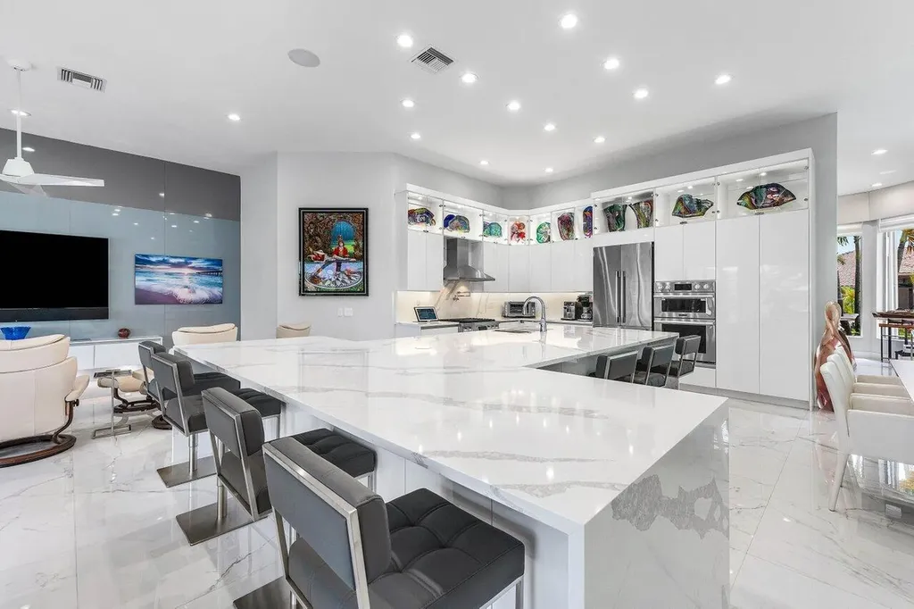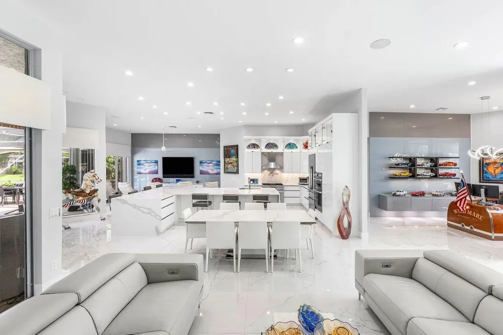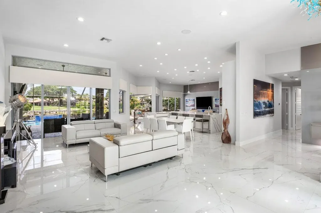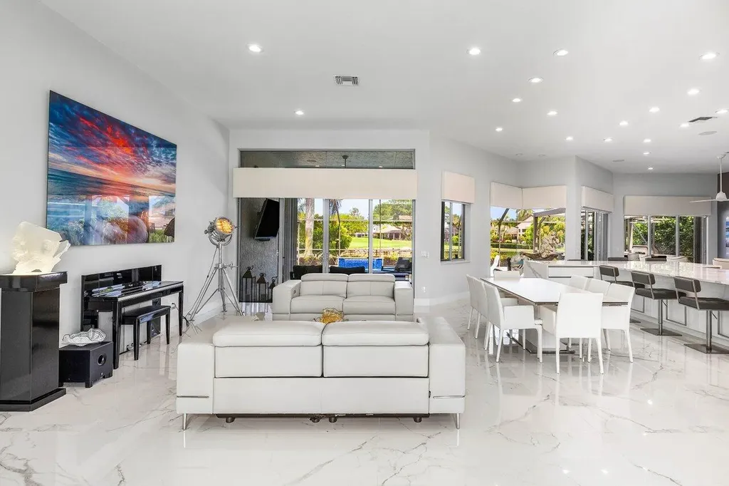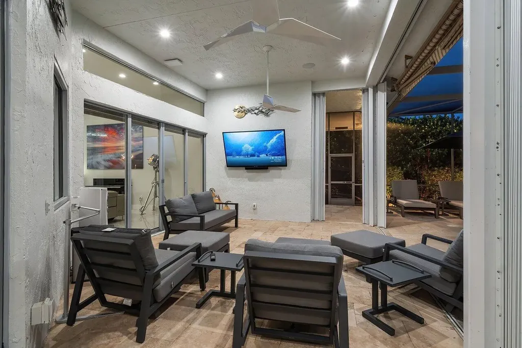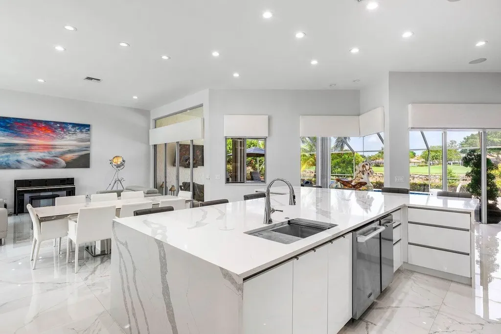 Welcome to this exquisitely renovated four-bedroom three bath luxury residence nestled in the heart of the sought-after Stonebridge Country Club. This is an opportunity to acquire a ''move-in, nothing needed'' home. Meticulously updated inside and out over the past two years ago with no expense spared, this elegant home blends timeless sophistication with modern comforts, offering the finest in South Florida living. From the moment you step inside, you're greeted by expansive living spaces adorned with designer porcelain tile flooring throughout. New custom cabinetry including floating cabinets with under lighting were installed in every room, providing the clean minimalist look awaiting your personal touch for accents. The outdoor kitchen features top-of-the-line built-in appliances, an oversized grill, Hibachi style griddle, separate countertop burner, refrigerator drawers, storage cabinet, and generous counter space, including a seating area with quartz countertop and waterfall edge. This area, and an associated dining area, are protected from the elements with a custom hurricane rated pergola with movable louvers which can be controlled via remotes or wired switch with an automatic closure function in the event of rain. The pergola contains integrated lighting and four ceiling fans, creating the ultimate space for alfresco dining and entertaining irrespective of the elements. The outdoor experience is complemented by a covered living area with ceiling fans and featuring a 75 inch Sunbrite television with audio system. A high end music system with overhead and rock speakers provides concert style audio over the entire area including the pool. The exterior is complemented by all new landscaping with landscape lighting, sidewalks and sprinkler system. Additional features include a whole-home generator, motorized blinds throughout the house, comprehensive whole house water purification system, new large-screen TV's with integrated sound systems in the master bedroom and family room, custom cabinetry and shelving with integrated lighting in office, ceiling fans throughout, smart toilets and numerous other upgrades that ensure comfort, security, and peace of mind. Stonebridge Country Club offers an exceptional lifestyle with world-class golf, tennis, dining, and social amenities. This is more than a homeit's a statement of elegance and modern luxury.