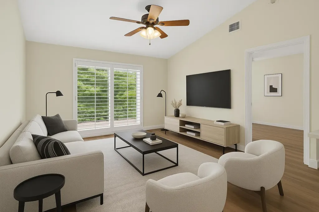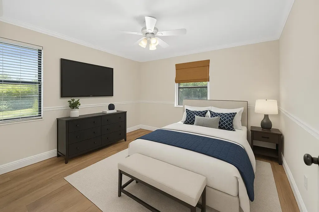 The spacious primary suite offers a tranquil retreat, complete with a walk-in closet and a spa-inspired bathroom. This elegant en-suite includes a sleek white vanity with soft-close drawers, quartz countertops, and a frameless walk-in shower with oversized travertine-style tile, a rainfall showerhead, and a handheld fixture. Two additional guest bedrooms feature reach-in closets and share an upgraded bathroom with modern tilework, a tub and shower combination, and a designer vanity with quartz surface.