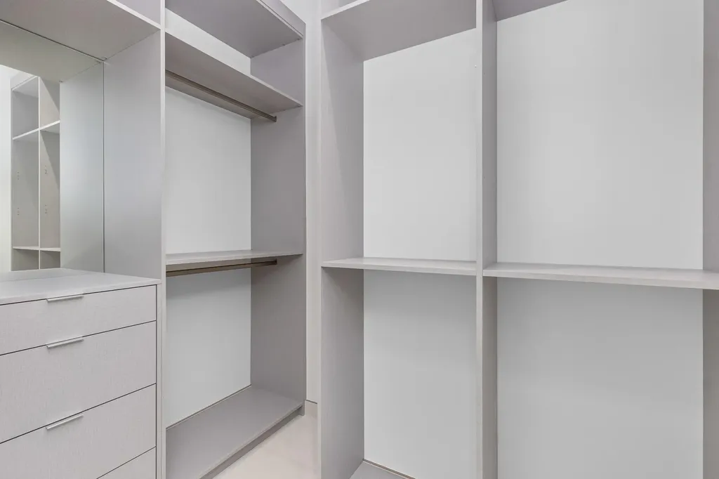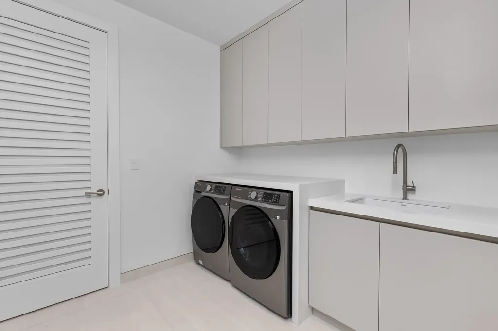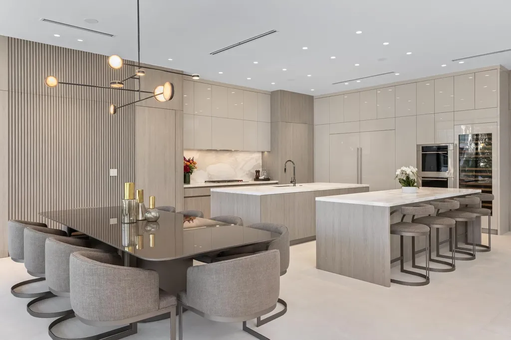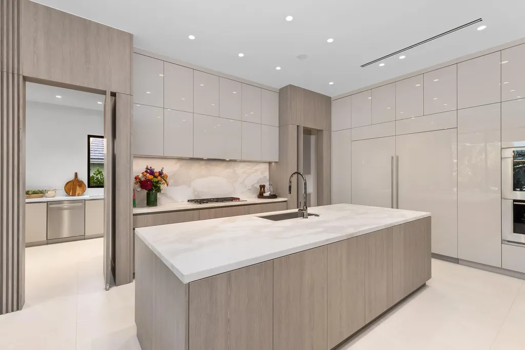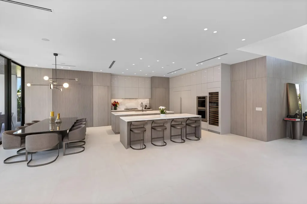 The chef's kitchen is a showcase of exquisite craftsmanship, fitted with custom stonework, sleek cabinetry, and top-of-the-line Wolf and Sub-Zero appliances. A hidden secondary kitchen and laundry room are discreetly tucked behind matching millwork, enhancing both beauty and functionality.