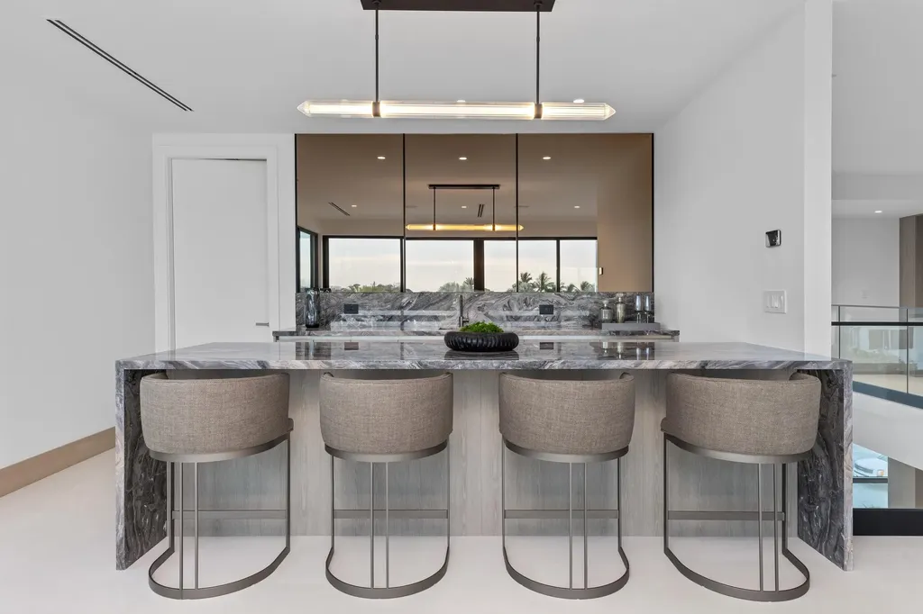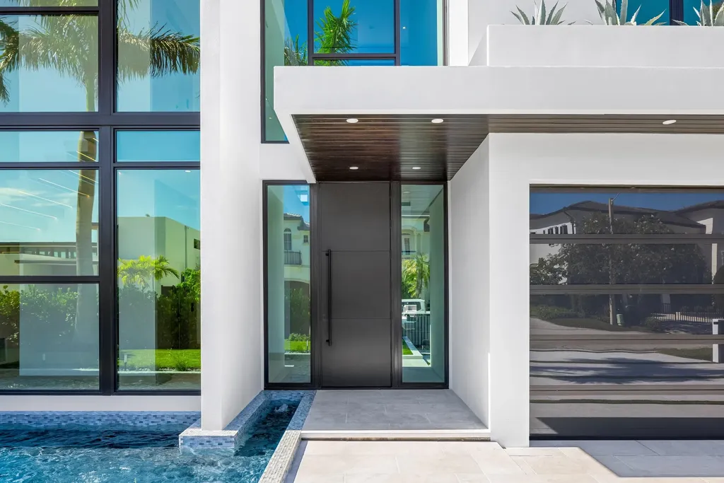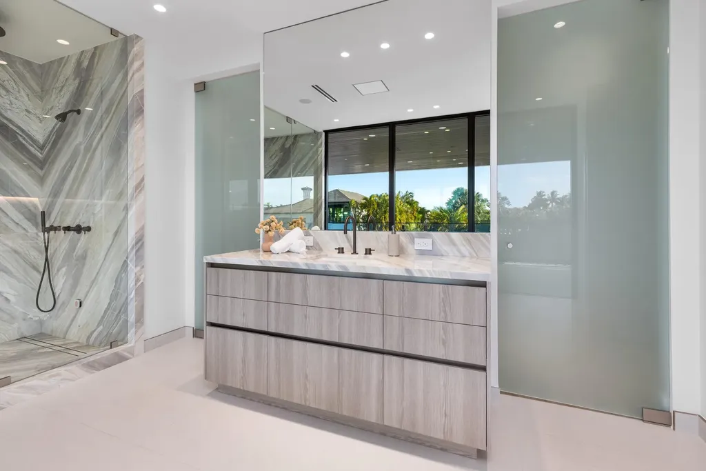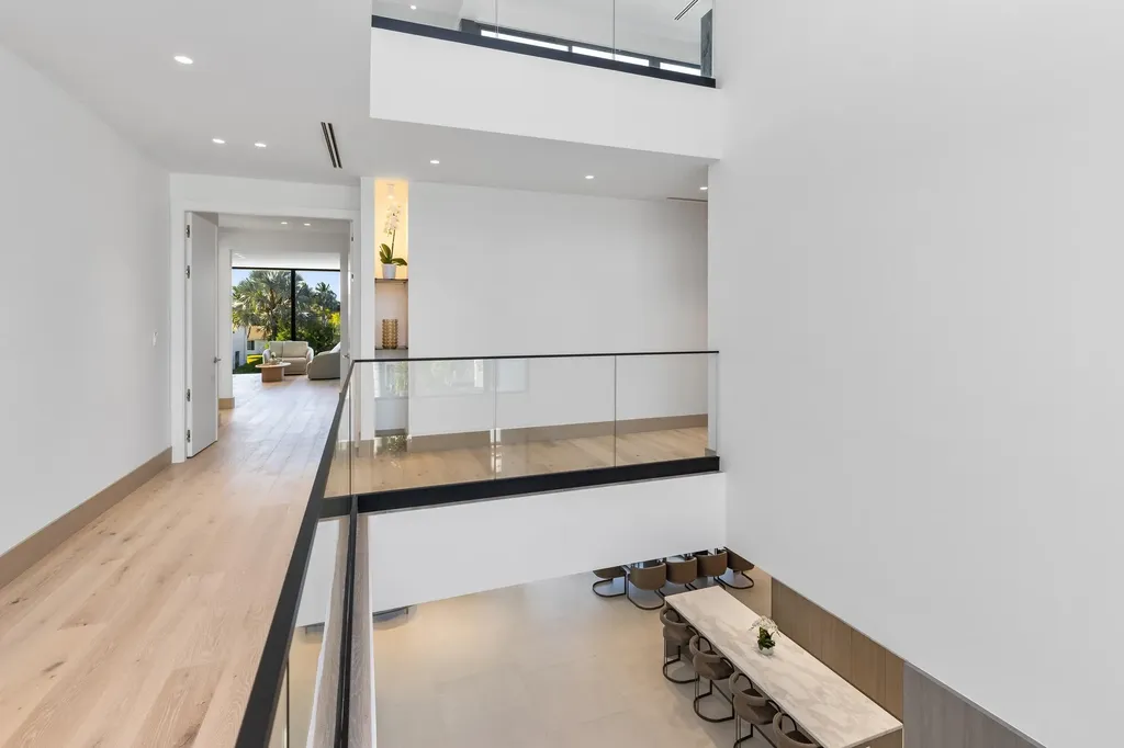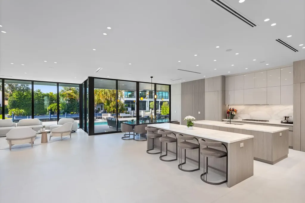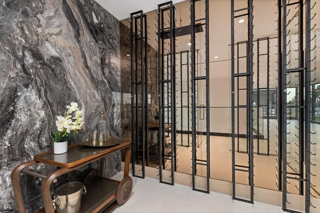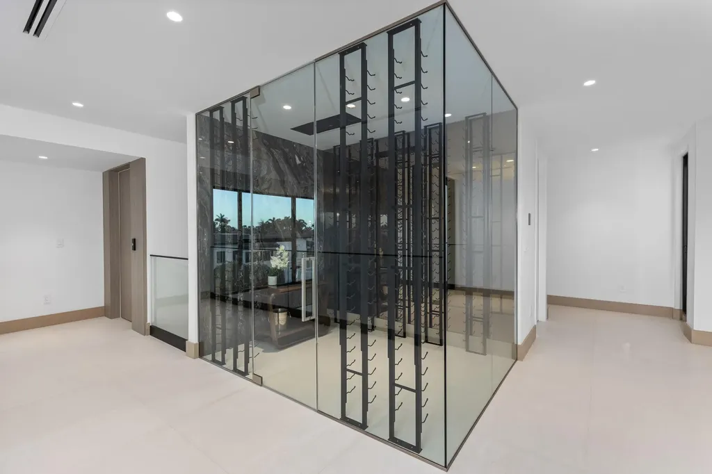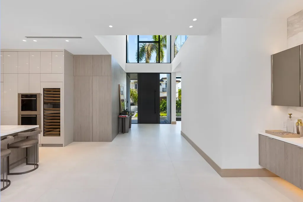 The home's design blends contemporary elegance with functional sophistication. Towering 32-foot glass walls welcome you into a soaring foyer, offering a dramatic sense of arrival. Throughout the residence, glass expanses blur the line between indoors and out, framing lush tropical landscaping and tranquil water vistas.