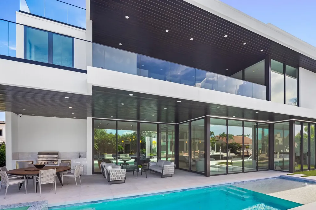 Outdoors, a resort-style pool and spa provide the perfect backdrop for relaxation and entertaining. The three-car garage, with hurricane-rated glass doors and high ceilings, accommodates up to six vehicles with the addition of lifts.