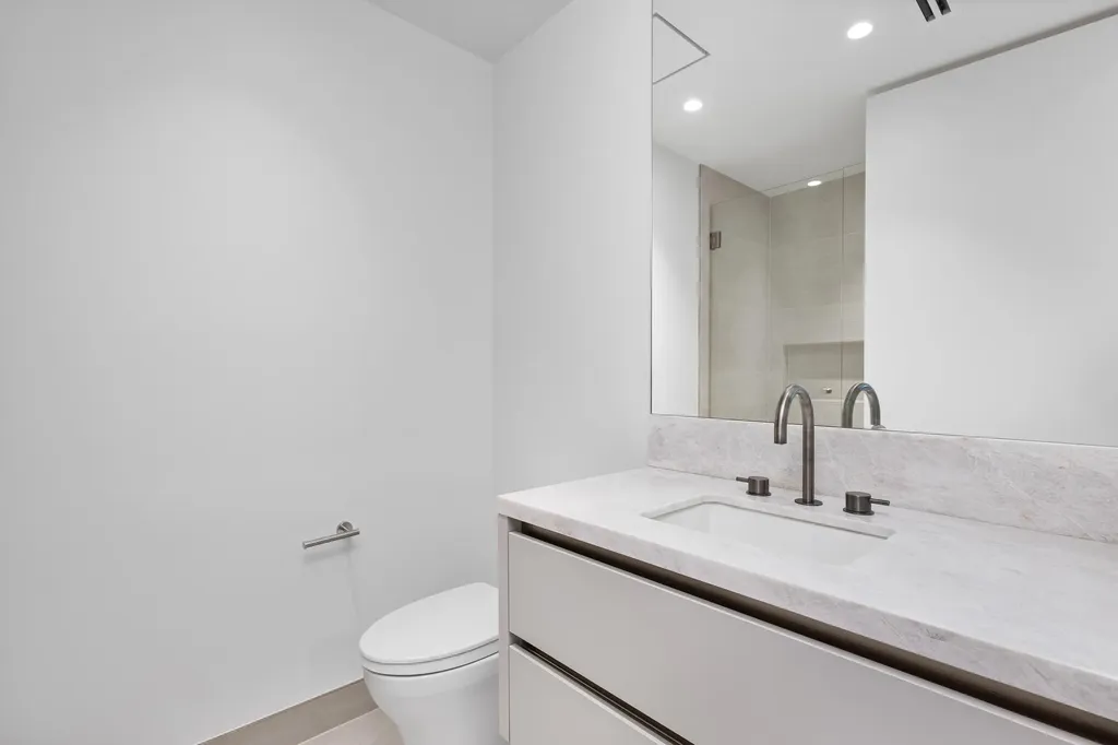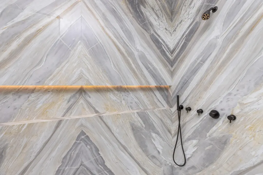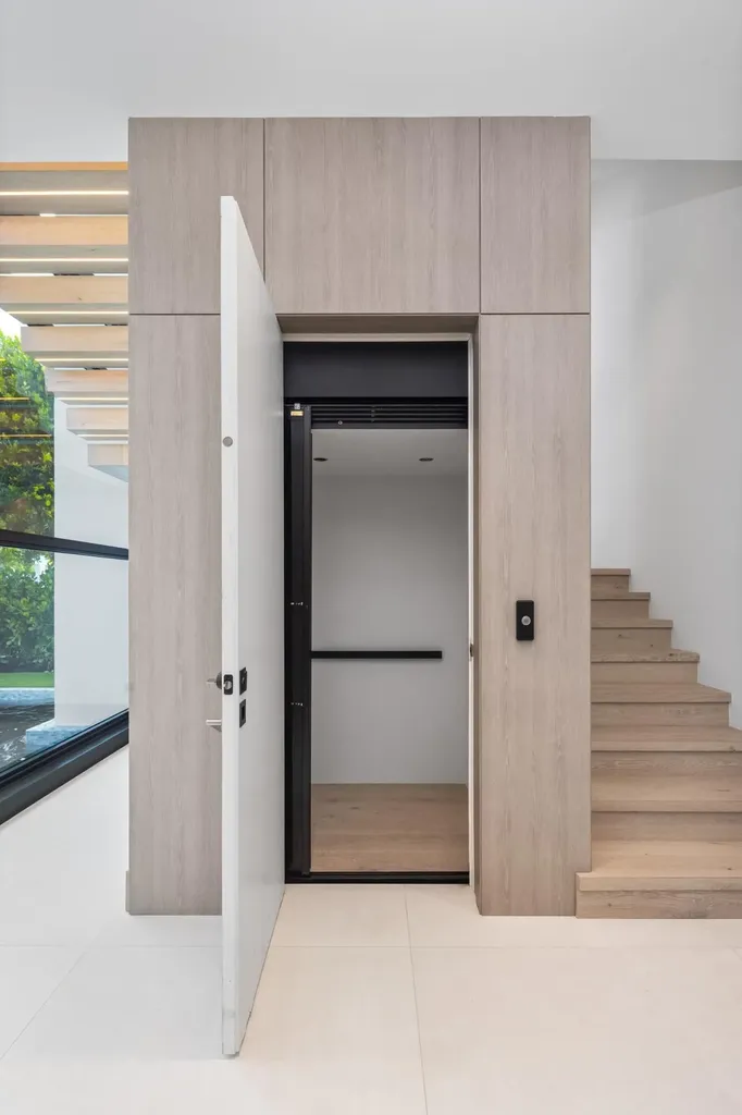 Every surface and material has been meticulously curated. Oversized 4' x 4' Italian porcelain tile defines the main level, while a sculptural floating staircase in white oak leads to upper floors adorned in the same rich wood tones, seamlessly tying the living spaces together.
