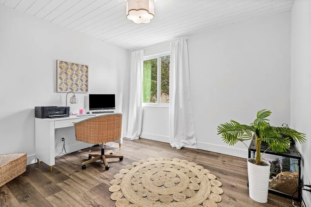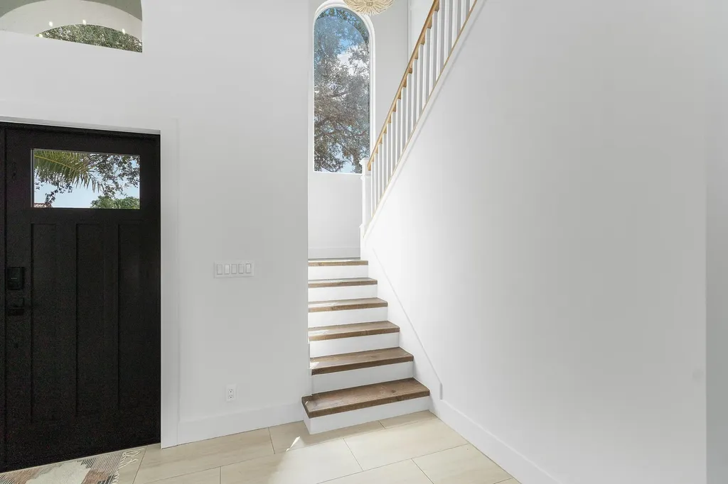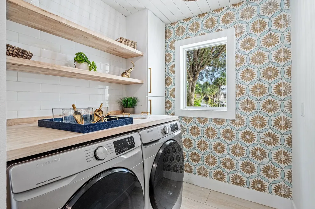 Upstairs, all five bedrooms are tucked away for privacy and convenience. The spacious primary suite features a walk-in closet and a fully renovated spa-inspired bathroom with dual vanities, brass fixtures, a soaking tub, and a frameless glass shower. Four additional bedrooms share a modernized bathroom with upscale finishes, offering plenty of space for family, guests, or a home office. A beautifully designed laundry room with built-in cabinetry and patterned accent wall adds both function and style.