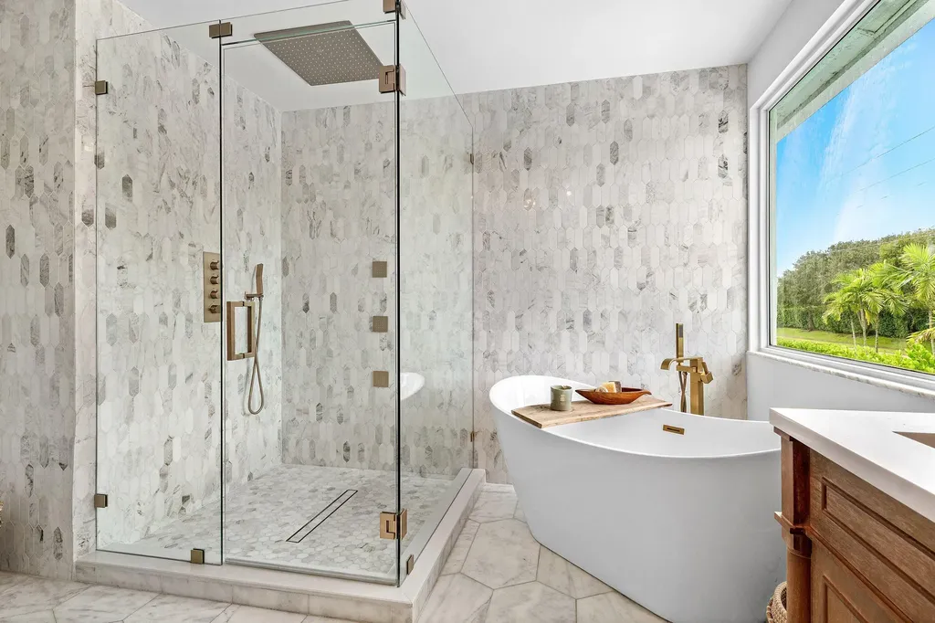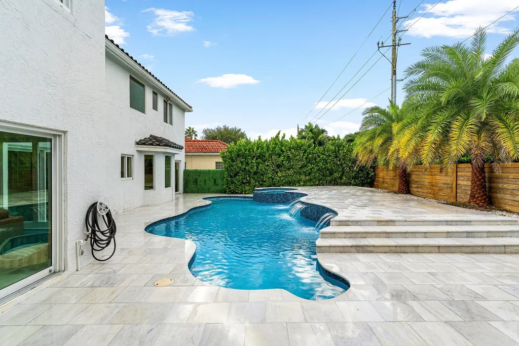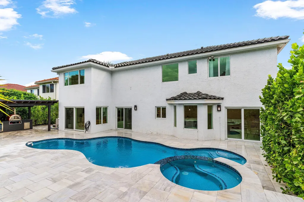 The backyard is a true resort retreat. A heated, saltwater pool and spa with new tile finishes invite year-round relaxation. The expansive marble patio is ideal for entertaining, featuring a full outdoor summer kitchen, pizza oven, and covered pergola. Lush palms and professional landscaping ensure privacy and a serene setting.
