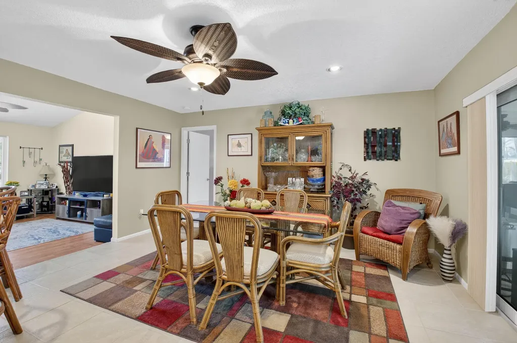 Inside, an open and flexible floor plan is perfect for entertaining and family living. The main living area includes a bright sitting room and vaulted great room with solid oak flooring, large energy-efficient tinted impact windows, and a unique glass block half-wall for architectural interest. Popcorn ceilings were replaced with knockdown texture for a modern, clean finish. The updated kitchen features granite countertops throughout, ample white cabinetry, sleek black appliances, and a breakfast bar that flows seamlessly into the dining area and screened patio. Ceiling fans in every room provide energy-efficient comfort.