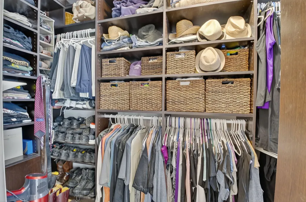 Adjacent to the kitchen, the laundry room (painted 2025) includes built-in cabinetry, a utility sink, closet storage, and attic access. The updated electrical panel (2025) with replaced GFI outlets and a fully inspected water heater adds convenience and peace of mind. The primary suite is a private retreat with wood-look flooring, a large walk-in closet, and sliding glass doors leading directly to the pool patio. The primary bathroom features a long granite-topped vanity with rich wood cabinetry and a spacious walk-in shower.