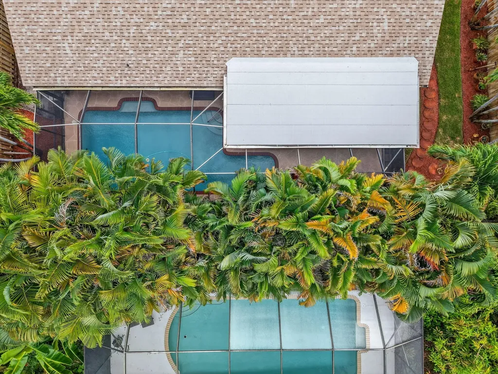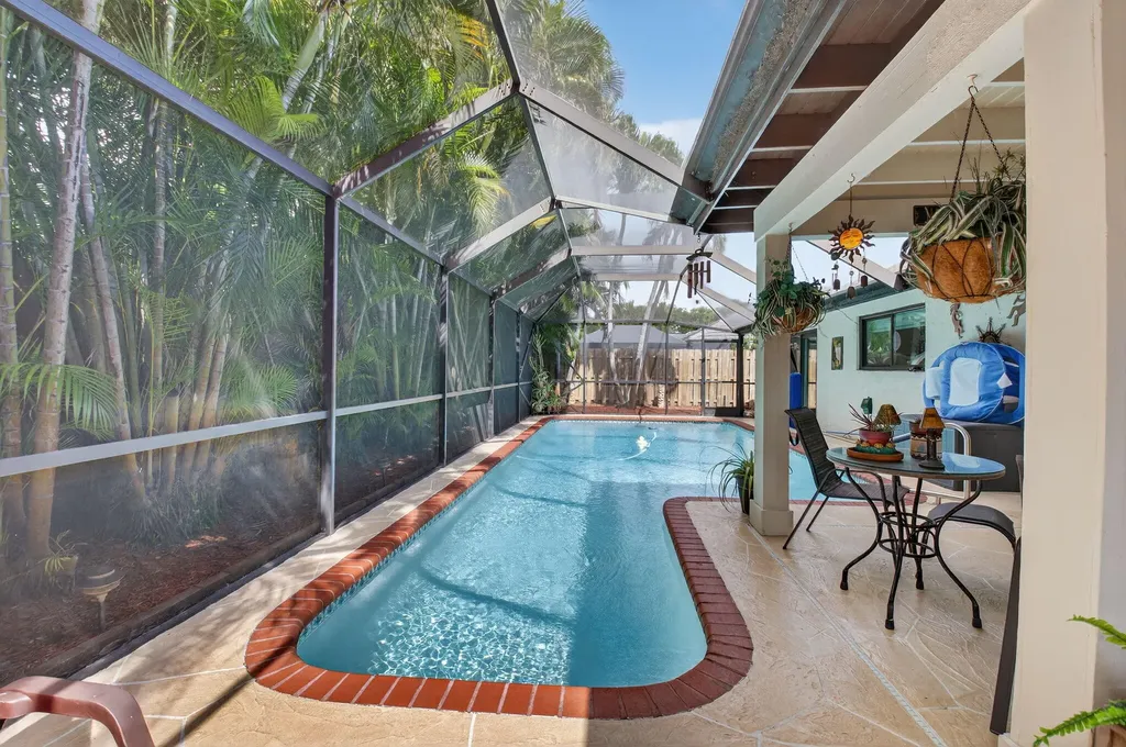 Step outside to your tropical oasis! The screened-in saltwater pool, resurfaced in 2022, features a jetted spa section for relaxation. The large patio includes stone-look flooring, a covered area with ceiling fans, and ample space for outdoor entertaining. The side yard with a double gate allows secure storage for an RV, boat, or jet skisor space for a garden, play area, or putting green. All pool equipment, including the exterior storage container with supplies, stays with the home.
