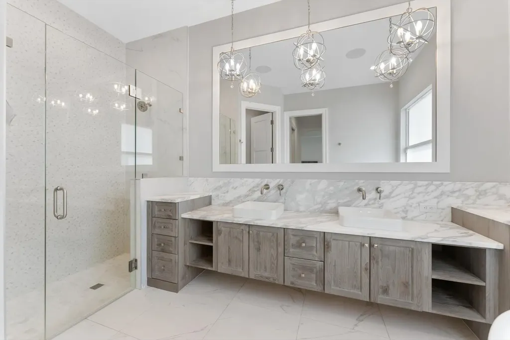 * Floating oak vanities | Freestanding soaking tub | Dual sinks | Glass shower