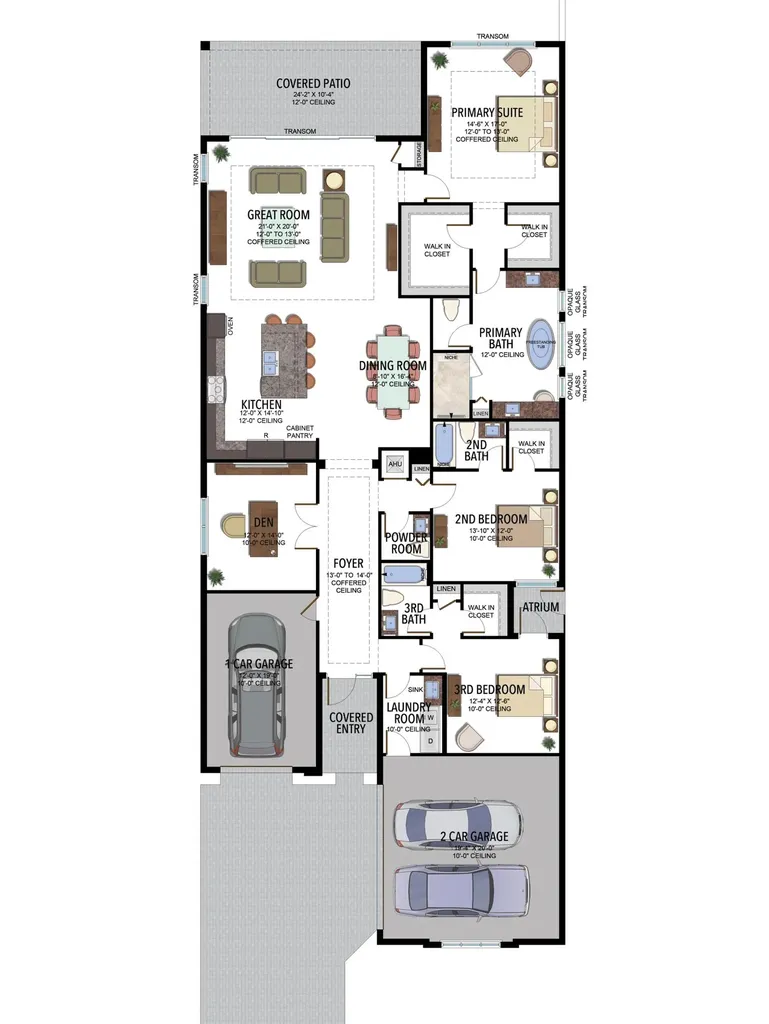 The primary suite offers a private retreat with calming views and a spa-style bathroom featuring frameless glass shower doors and refined finishes. Custom-designed walk-in closets by Closet Factory provide exceptional storage and organization. A split-bedroom layout ensures privacy and comfort for family and guests, while the multipurpose den/office offers flexibility for remote work, a media room, or an additional guest space.