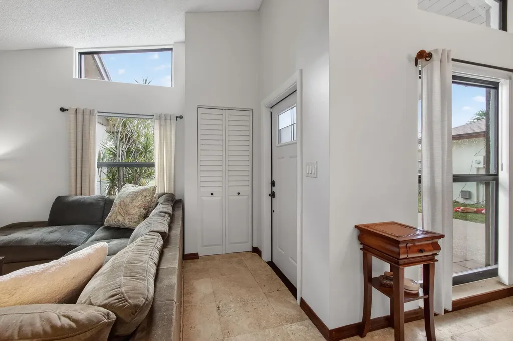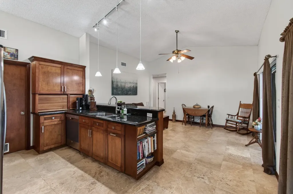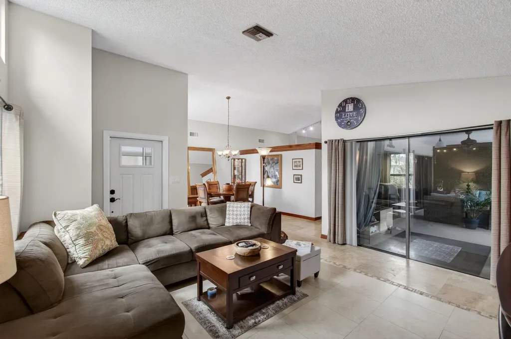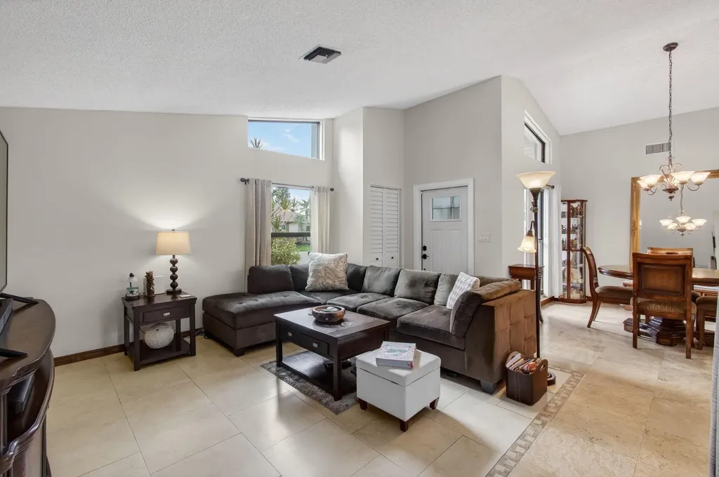 This meticulously maintained 3 bedroom, 2 bath, 1 car garage single-family home is ideally located in the highly desirable Loggers Run community of West Boca Raton, perfectly situated on a private, oversized corner lot. Recently painted inside and out, the home presents a fresh, move-in-ready feel, with tinted windows and doors for enhanced energy efficiency and privacy. Nearly all openings are equipped with hurricane-impact windows and doors, and hurricane panels are provided for the non-impact sliding doors, offering added peace of mind. Entering the home, you are immediately greeted by soaring vaulted ceilings, architectural ceiling details, and clerestory-style windows that flood the open-concept living spaces with abundant natural light. Durable travertine-style tile flows seamlessly throughout the main areas, creating a cohesive, low-maintenance design. The formal living and dining areas provide a flexible layout suitable for both everyday living and elegant entertaining. The dining space is enhanced by crown molding, a statement chandelier and adding sophistication and depth to special occasions.