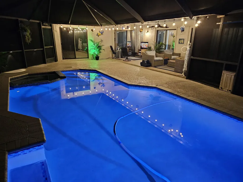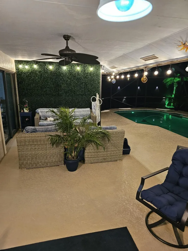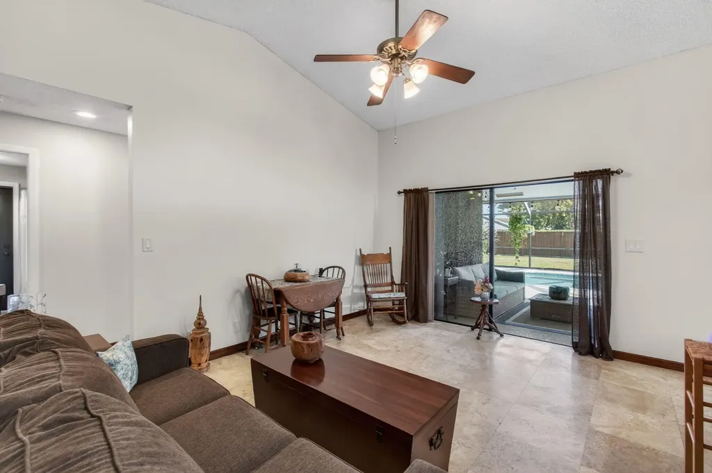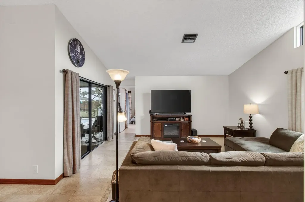 A secondary living area offers a versatile retreat with direct access to the pool deck through sliding glass doors, ideal as a family room, media space, or home office.
