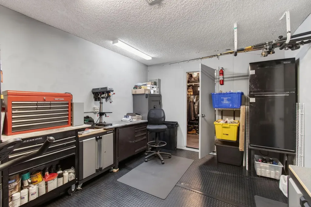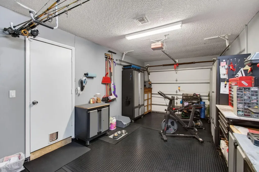 The 1-car garage is a versatile space perfect for both productivity and fitness, featuring durable diamond-plate rubber flooring and abundant overhead lighting. Painted walls, a textured ceiling, and integrated air conditioning ensure comfort year-round, while thoughtful extras like ceiling-mounted fishing rod racks add convenience and functionality.