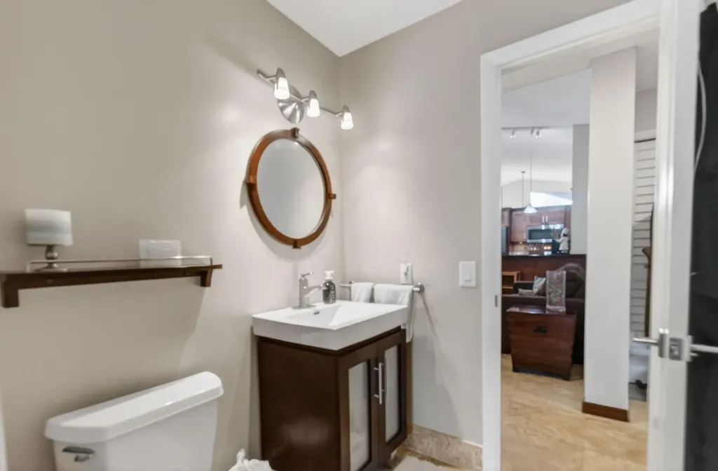 The 2 guest bedrooms are equally well-appointed, offering versatile spaces that can function as offices, craft rooms, or media areas. Each bedroom includes custom closet organizers, while the guest bathroom is designed with coastal-inspired elegance, combining warm neutrals with cool sea-foam and blue accents. A herringbone-patterned subway tile in the shower adds texture and subtle color, complemented by a dark wood vanity with frosted glass inserts, a clean white integrated sink, a circular wood-framed mirror, and modern 3 bulb track lighting. Brushed nickel hardware throughoutincluding the faucets, showerhead, and towel barsharmonizes with the soothing tile tones, while large-format natural stone or porcelain flooring extends into the hallway for a seamless, cohesive flow.