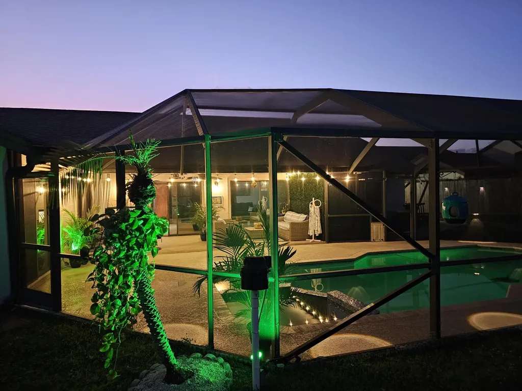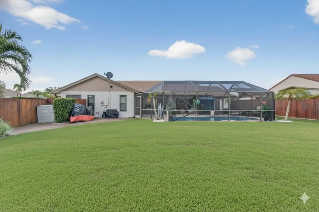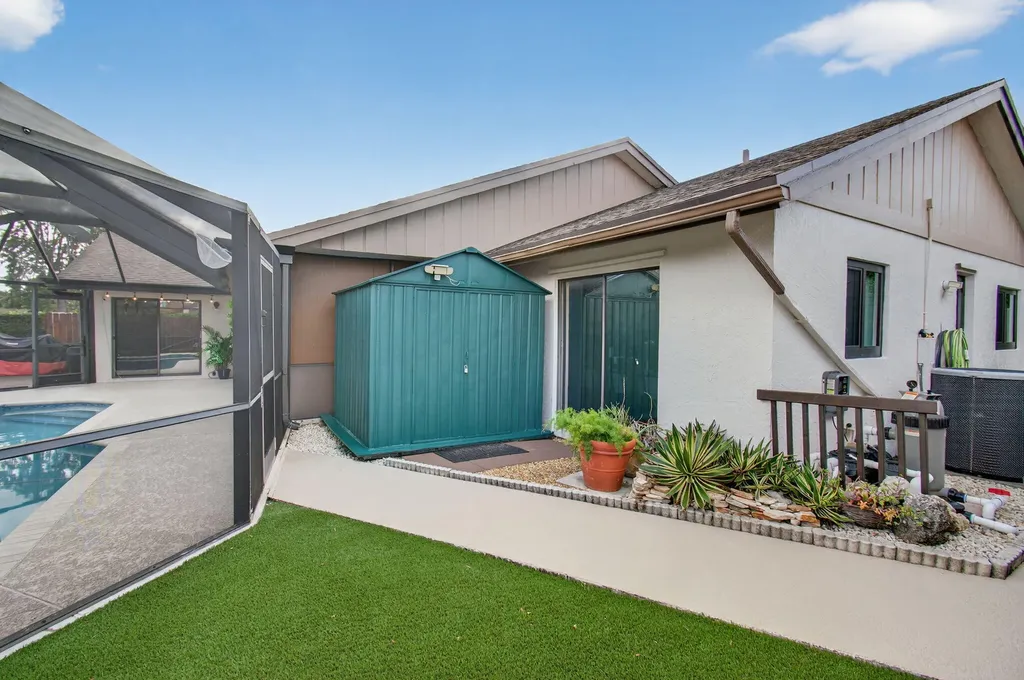 Step outside to a private backyard oasis thoughtfully designed for year-round enjoyment. The saltwater pool with an integrated elevated spa is fully enclosed within a screened-in lanai and has been updated with new tile, recoating, and a Diamond Brite finish. The pool heater and saltwater system were upgraded in 2024, and the expansive pool deck, refreshed approximately two years ago, provides abundant space for lounging, outdoor dining, and entertaining. Beyond the lanai, the backyard features a harmonious blend of lush grass, low-maintenance artificial turf, mature hedges, and tropical landscaping, creating a serene, resort-style retreat. A concrete walkway leads to 2 outdoor storage sheds, one of which is equipped with electricity for added convenience. Additional exterior highlights include a 6-zone sprinkler system and a 2024 hot water heater, enhancing both the functionality and comfort of this exceptional property.