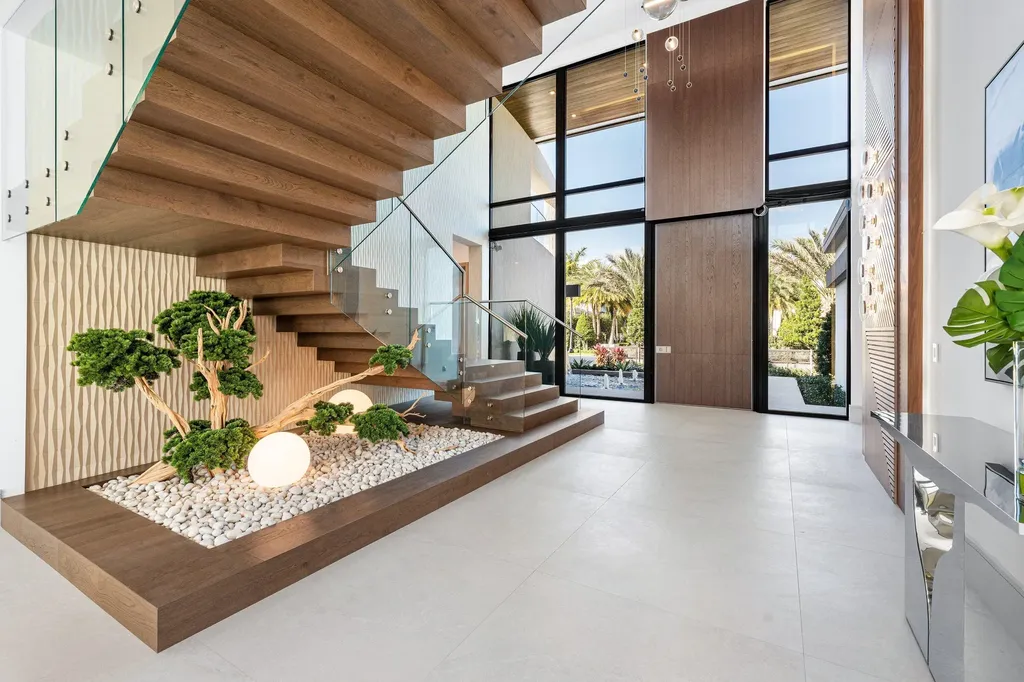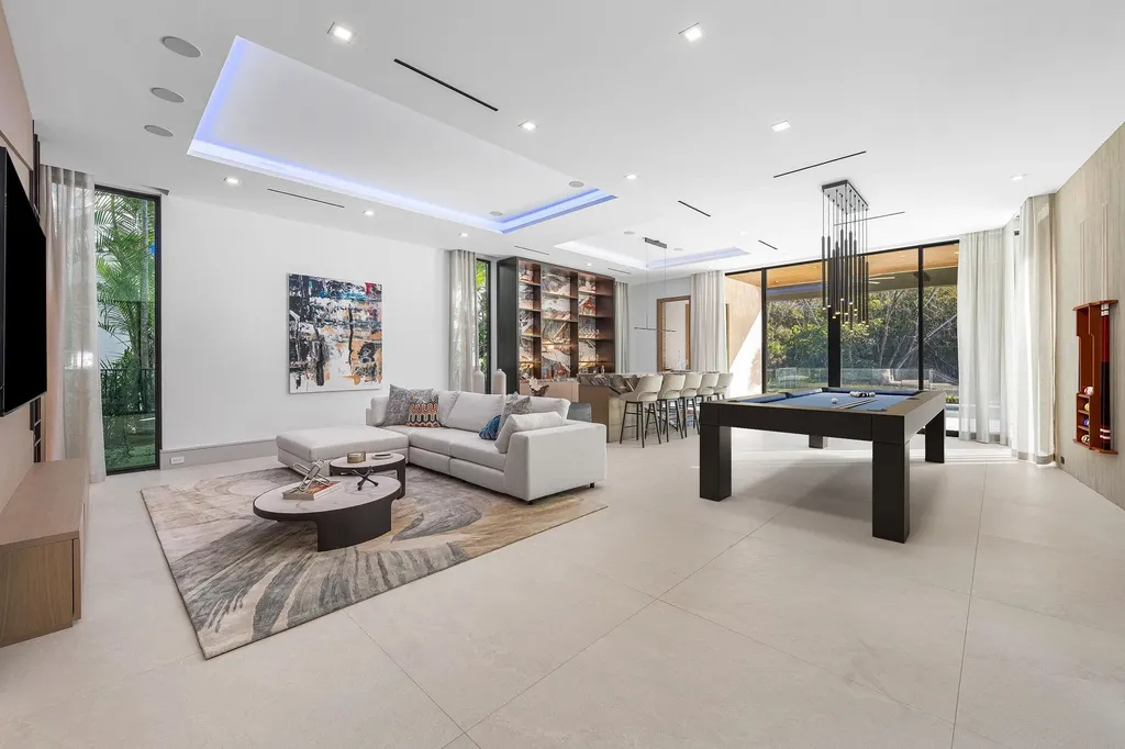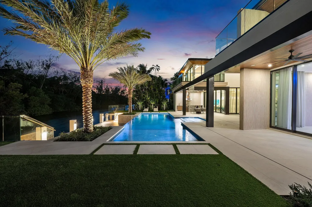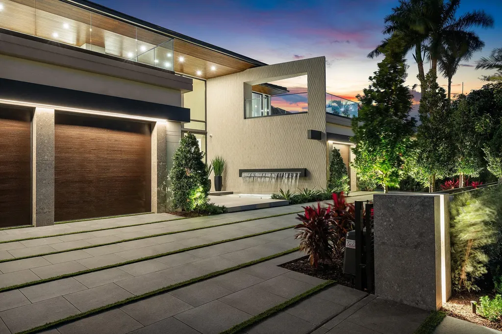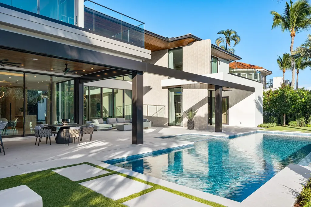 Set along 100 feet of pristine waterfront in Royal Palm Yacht & Country Club, this extraordinary residence is perfectly positioned across from the preserved natural sanctuary of Capone Island--an undeveloped mangrove island that provides enduring privacy, lush green vistas, and a rare sense of calm. The setting is remarkably serene, offering a waterfront perspective defined by nature rather than neighboring homes. Constructed by Albanese Builders and exquisitely designed and furnished by BE Designs, the home reflects a level of craftsmanship and intention seldom achieved. Spanning 8,993.70 square feet under air and 11,633.04 total square feet, the residence is introduced by soaring ceilings and a grand, wide staircase that immediately establishes architectural presence. The fully concrete second level underscores the home's structural integrity and enduring quality. Seven bedrooms and nine-and-a-half baths are arranged with equal attention to scale and intimacy. A refined club room with custom bar and pool table transitions seamlessly into a glass-enclosed office, creating a dramatic yet functional environment. At the heart of the home, a double-island chef's kitchen is appointed with top-of-the-line Miele appliances and complemented by a discreet butler's pantry, designed for both elevated entertaining and everyday living. Two laundry rooms provide thoughtful convenience. Materiality defines the interiors. Italian porcelain accent walls, a striking marble fireplace, and decorative fireplaces throughout elevate the architectural language, while sculptural water featuresboth at the entry and cascading beside the resort-style poolcreate a sense of movement and tranquility. An outdoor firepit anchors the exterior living spaces, while electric shades throughout the home ensure effortless comfort and privacy. The residence is further distinguished by bespoke furnishings from Covet House, curated to harmonize with the home's architecture and elevate each space. A four-car garage with a separate golf cart entry completes the offering. Rare in its setting, exceptional in its execution, and uncompromising in its finishes, this is a truly one-of-a-kind waterfront estatedefined by serenity, sophistication, and architectural distinction.