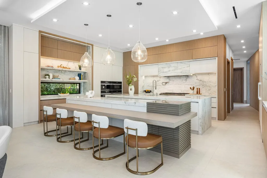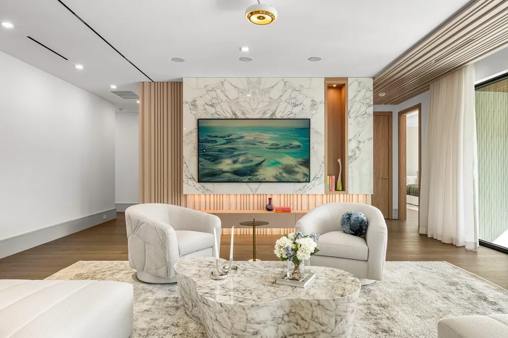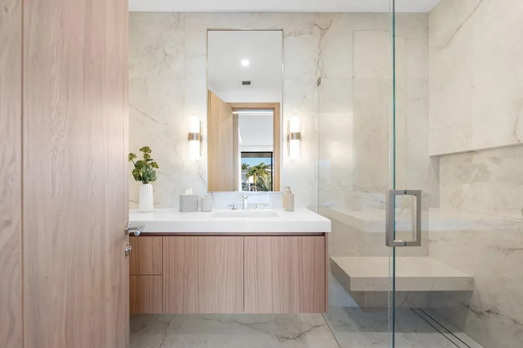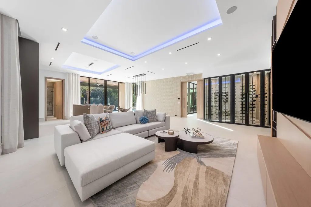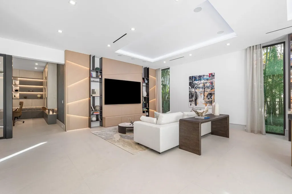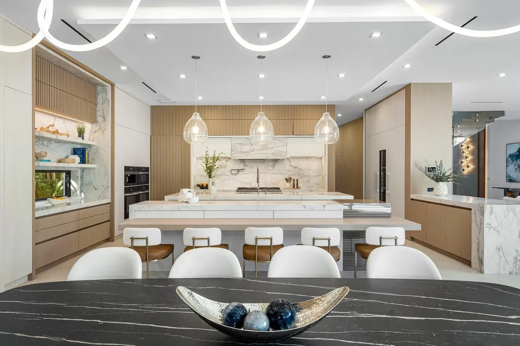 Set along 100 feet of pristine waterfront in Royal Palm Yacht & Country Club, this extraordinary residence is perfectly positioned across from the preserved natural sanctuary of Capone Island--an undeveloped mangrove island that provides enduring privacy, lush green vistas, and a rare sense of calm. The setting is remarkably serene, offering a waterfront perspective defined by nature rather than neighboring homes. Constructed by Albanese Builders and exquisitely designed and furnished by BE Designs, the home reflects a level of craftsmanship and intention seldom achieved. Spanning 8,993.70 square feet under air and 11,633.04 total square feet, the residence is introduced by soaring ceilings and a grand, wide staircase that immediately establishes architectural presence. The fully concrete second level underscores the home's structural integrity and enduring quality. Seven bedrooms and nine-and-a-half baths are arranged with equal attention to scale and intimacy. A refined club room with custom bar and pool table transitions seamlessly into a glass-enclosed office, creating a dramatic yet functional environment. At the heart of the home, a double-island chef's kitchen is appointed with top-of-the-line Miele appliances and complemented by a discreet butler's pantry, designed for both elevated entertaining and everyday living. Two laundry rooms provide thoughtful convenience. Materiality defines the interiors. Italian porcelain accent walls, a striking marble fireplace, and decorative fireplaces throughout elevate the architectural language, while sculptural water featuresboth at the entry and cascading beside the resort-style poolcreate a sense of movement and tranquility. An outdoor firepit anchors the exterior living spaces, while electric shades throughout the home ensure effortless comfort and privacy. The residence is further distinguished by bespoke furnishings from Covet House, curated to harmonize with the home's architecture and elevate each space. A four-car garage with a separate golf cart entry completes the offering. Rare in its setting, exceptional in its execution, and uncompromising in its finishes, this is a truly one-of-a-kind waterfront estatedefined by serenity, sophistication, and architectural distinction.