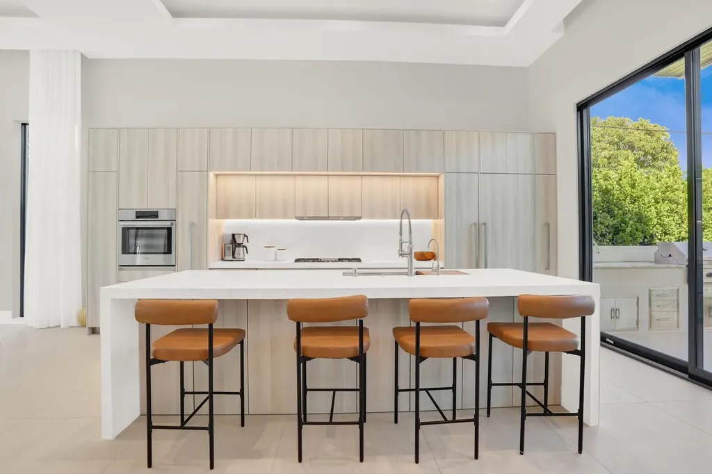 The gourmet kitchen is both functional and striking, anchored by an oversized waterfall quartz island with seating and abundant storage. Bosch appliances, a natural gas range, an oversized sink with premium fixtures, illuminated cabinetry, and dual pull-out pantries make this space ideal for both daily living and entertaining.
