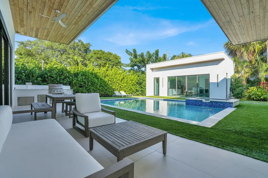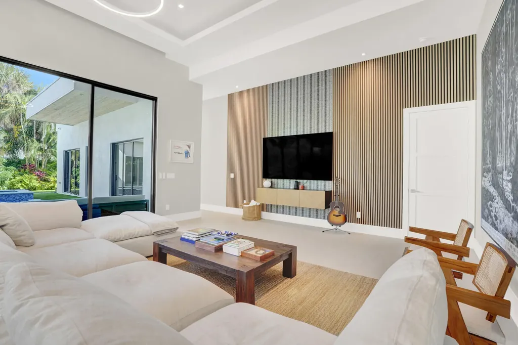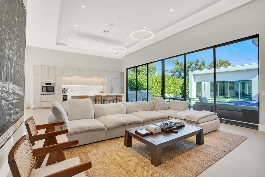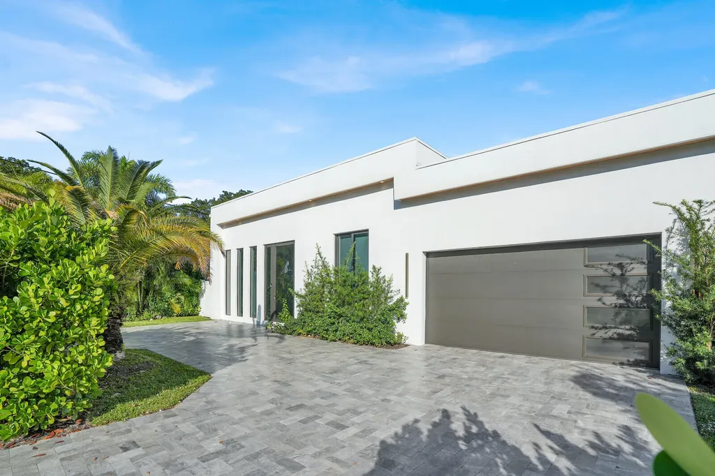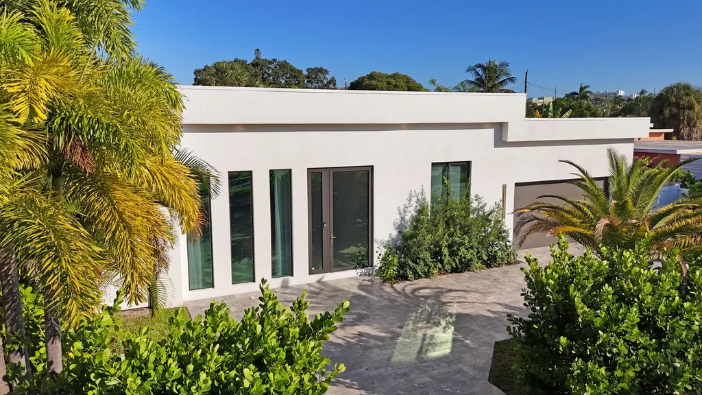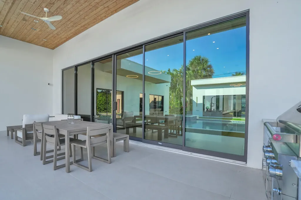 Welcome to East Boca, where refined architecture and resort-style living converge in this exceptional, newly built contemporary estate. Completed in 2023, this custom-designed residence offers approximately 3,200 square feet under air and over 4,200 square feet in total, thoughtfully curated to deliver both elevated design and everyday comfort.From the moment you arrive, the home makes a striking impression with its landscaped frontage, circular travertine driveway, and dramatic 10-foot Eurotech impact glass entry door. Solid construction, energy-efficient low-E impact windows and sliders, spray-foam insulation, and a pitched flat roof with gutters reflect a commitment to quality, durability, and modern performance.Inside, soaring ceilings--14 feet in the main living in the bedrooms - create a grand yet inviting atmosphere. Oversized sliders spanning nearly 30 feet, frame views of the resort-style pool and spa, fill the home with natural light and seamlessly blend indoor and outdoor living. Neutral large-format porcelain tile flows throughout, complemented by custom design elements including a natural oak feature wall, grass-cloth accents, quartz window sills, and designer LED lighting.