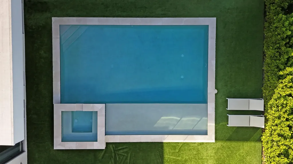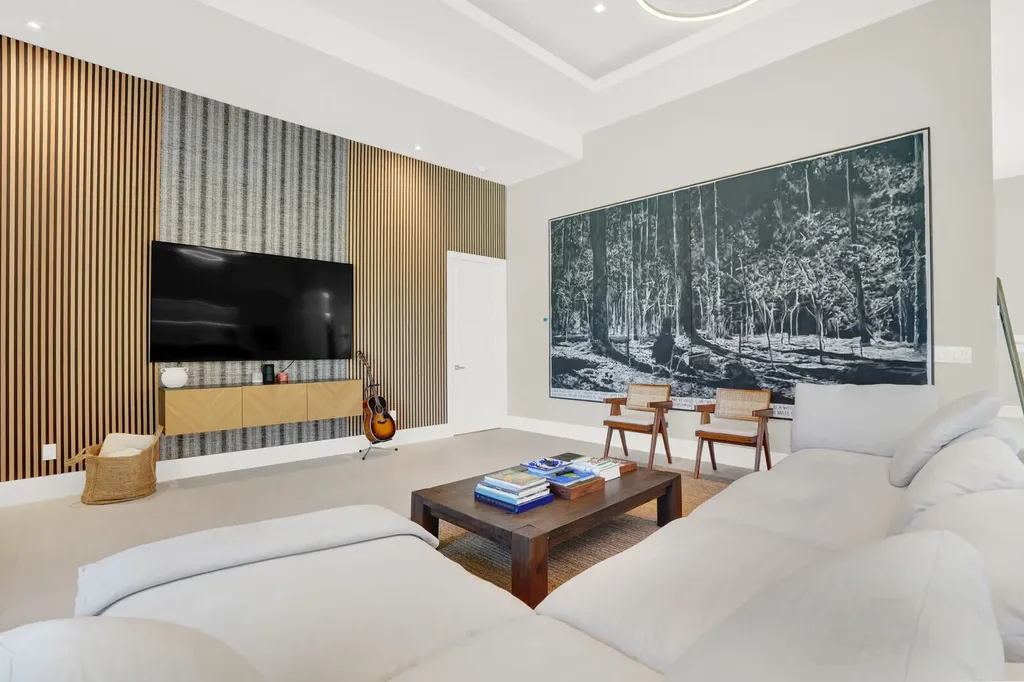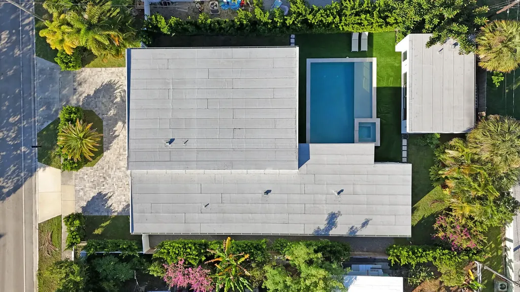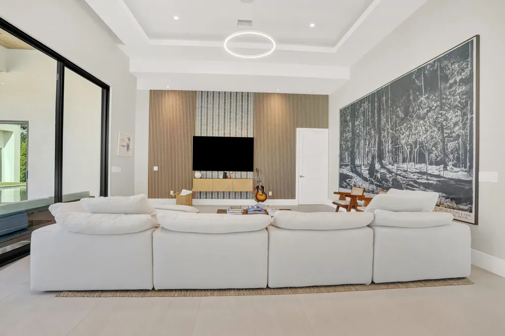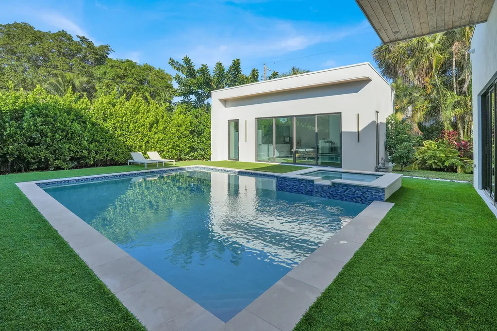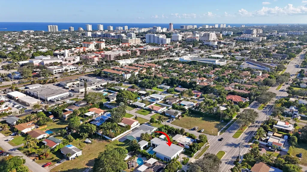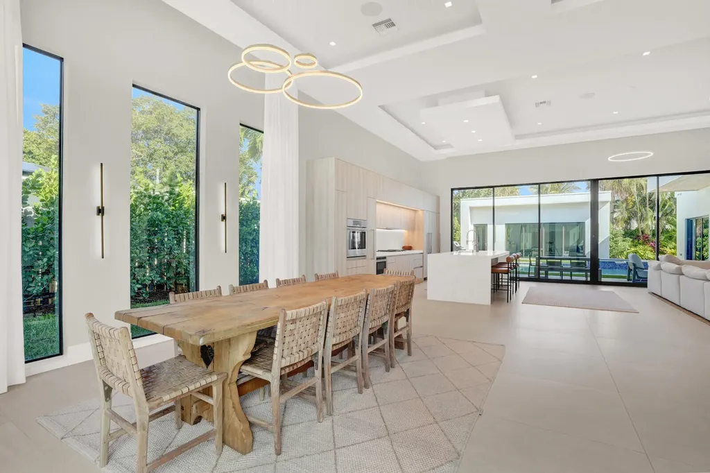 Welcome to East Boca, where refined architecture and resort-style living converge in this exceptional, newly built contemporary estate. Completed in 2023, this custom-designed residence offers approximately 3,200 square feet under air and over 4,200 square feet in total, thoughtfully curated to deliver both elevated design and everyday comfort.From the moment you arrive, the home makes a striking impression with its landscaped frontage, circular travertine driveway, and dramatic 10-foot Eurotech impact glass entry door. Solid construction, energy-efficient low-E impact windows and sliders, spray-foam insulation, and a pitched flat roof with gutters reflect a commitment to quality, durability, and modern performance.Inside, soaring ceilings--14 feet in the main living in the bedrooms - create a grand yet inviting atmosphere. Oversized sliders spanning nearly 30 feet, frame views of the resort-style pool and spa, fill the home with natural light and seamlessly blend indoor and outdoor living. Neutral large-format porcelain tile flows throughout, complemented by custom design elements including a natural oak feature wall, grass-cloth accents, quartz window sills, and designer LED lighting.