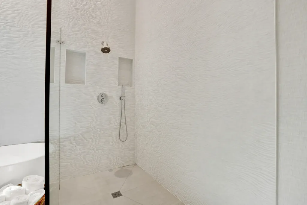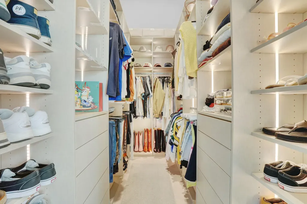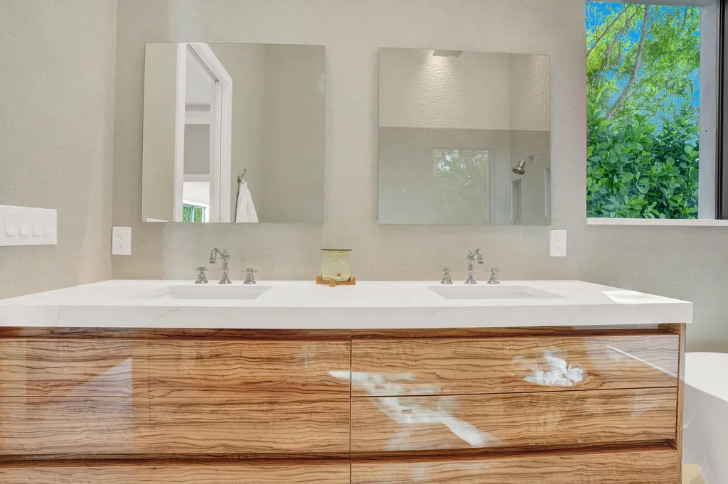 Each of the five bedrooms offers the privacy of its own en-suite bath, while the primary suite serves as a tranquil retreat with pool views, a custom walk-in closet with built-ins and lighting, and a spa-inspired bath featuring a freestanding soaking tub, expansive walk-in rain shower, floor-to-ceiling designer tile, and dual quartz vanity. A beautifully appointed powder room with a floating marble vanity adds an additional layer of sophistication.