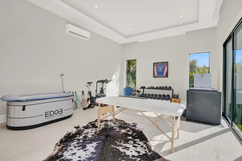 Adding exceptional flexibility, a detached casita overlooks the pool through expansive sliders and features a kitchenette, full bath with oversized shower, porcelain flooring, 12-foot ceilings, and its own full-size washer and dryer. This guest house is ideal for visitors, can be used as a home office, or as a state-of-the-art fitness studio.