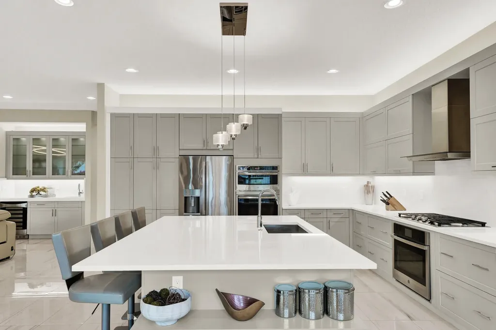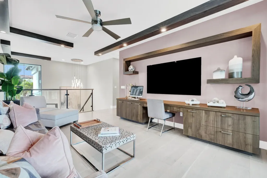 FORMER GL HOMES HONOLULU MODEL ON MODEL ROW! HOME WAS NOT MOVED INTO UNTIL 6/23! MOST FURNITURE STAYS! HOME CONSISTS OF 5BRS + LOFT, 5BTHS W/A 3 CAR OVERSIZED GARAGE W EPOXY FLOORING. ENTER INTO A GRAND ENTRY W HIGH CEILINGS! 24X48 PORCELAIN TILE ON THE 1ST FLOOR. GREAT ROOM HAS BUILT IN UNIT W/ WET BAR W UPPER GLASS CABINETS & WINE REFRIGERATOR. GOURMET KITCHEN HAS UPGRADED CABINETS W UPPER STACKED CABINETS, LOTS OF PULLOUTS, QUARTZ COUNTERTOPS, LARGE ISLAND, LARGE EATING AREA, & SS APPLIANCES INCLUDING A WOLF HOOD. OFF KITCHEN THERE IS A HUGE WALK IN PANTRY W BUILT IN SHELVING & A MUD ROOM W ADDITIONAL UPPER CABINETS. DOWNSTAIRS BEDROOM IS USED AS AN OFFICE W BUILT IN UNIT. THERE IS A GLASS STAIRCASE W HARDWOOD FLOORS GOING UP THE STAIRS & ENTIRE 2ND FLOOR.**HIT MORE FOR MORE INFO** THE 2ND FLOOR HAS A LARGE LOFT W A BUILT IN UNIT W GLASS DOORS LEADING OUT TO A VERANDA WHICH HAS A MOTORIZED SCREEN. PRIMARY BEDROOM HAS BUILT IN W MIRRORED WALLS, BATH W LARGE SHOWER & LARGE FREE STANDING TUB. THERE ARE 2 LARGE WALK IN CLOSETS. LAUNDRY ROOM HAS UPPER CABINETS W BRAND NEW LG WASHER & DRYER. THERE ARE 3 ADDITIONAL GENEROUS SIZE BEDROOMS & BATHS.