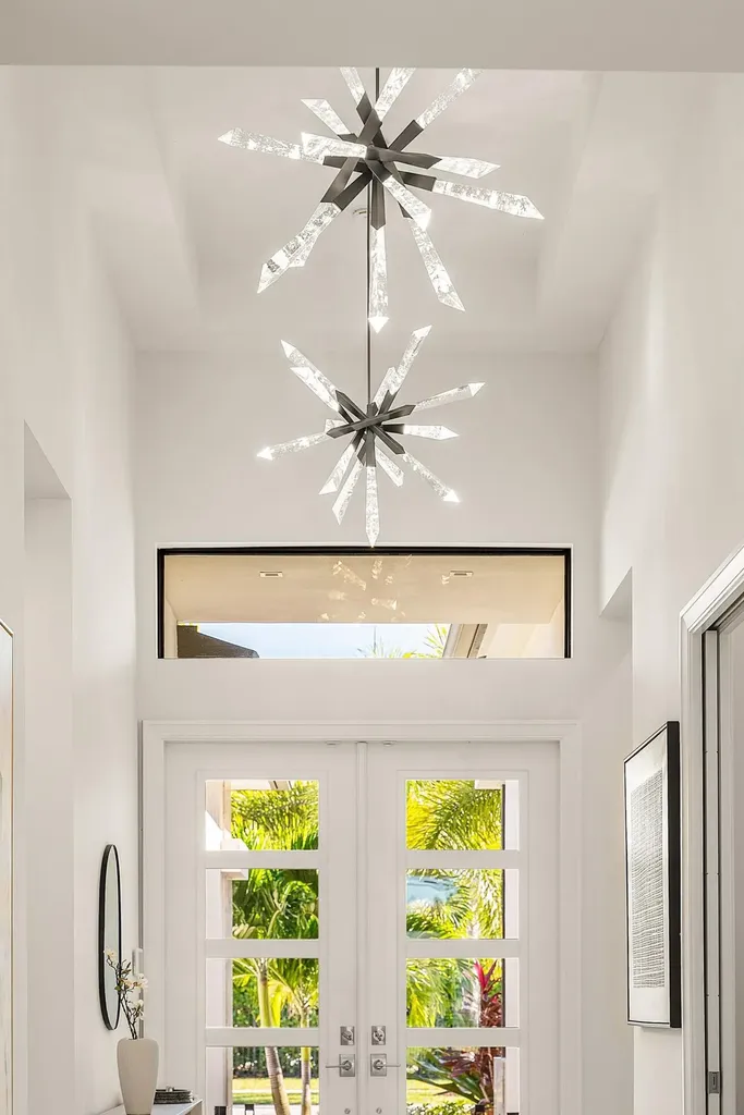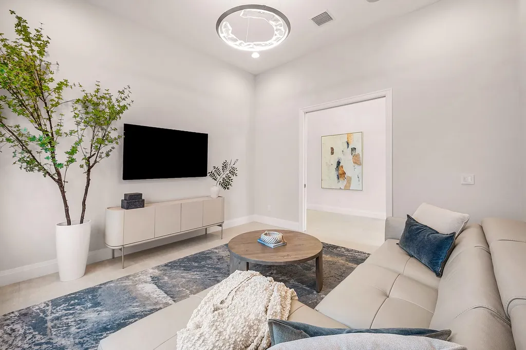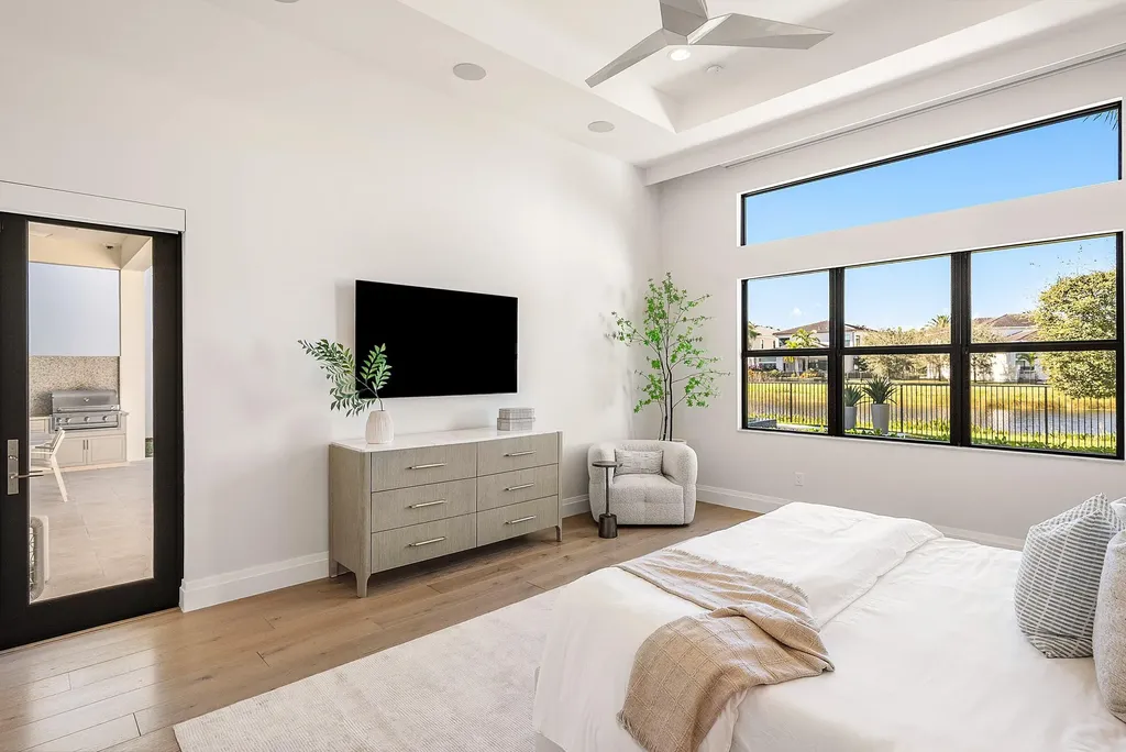 Welcome to 17135 Abruzzo Avenue, an exceptional Sevilla Contemporary residence in prestigious Boca Bridges on a premium lakefront lot. A thoughtfully curated SMART home, offering over-the-top upgrades, this single-story, 4 bedroom/3.5 bath (4th bedroom is currently set up as a den) is a masterpiece blending modern luxury, comfort and cutting-edge technology in one of South Florida's most coveted gated communities. The entry sets the tone: soaring ceilings, elegant Schonbek chandeliers, and an expansive sightline that draw the eye directly to the water. The main living space is anchored by oversized rectified 24x48 inch porcelain tile, while the bedrooms, wrapped in a wide-plank engineered white oak floors, offer warmth and quiet sophistication. Sunlight filters through motorized shades as the homes Lutron lighting system subtly shifts to match the moment.