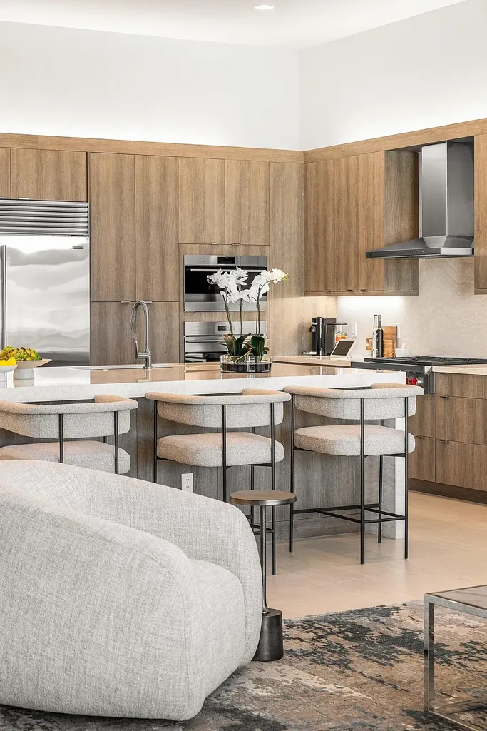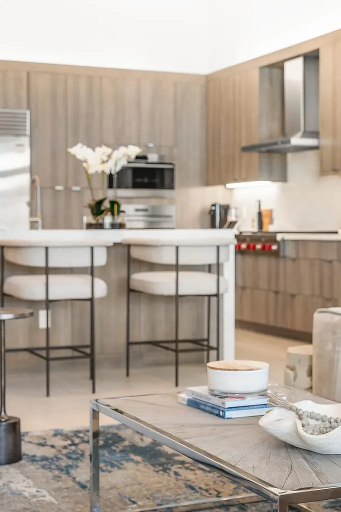 The kitchen is a masterpiece- equal parts architecture and culinary theater. Cambria Ironsbridge Quartz glows softly across the waterfall island, while a suite of Wolf and Sub-Zero appliances, including a steam oven, stands ready for the ambitious cook or catered event. Frameless custom cabinetry rises elegantly concealing storage that has been thoughtfully planned down to the smallest detail, including custom pullout sliding shelves. Every surface feels handcrafted; every choice, elevated.
