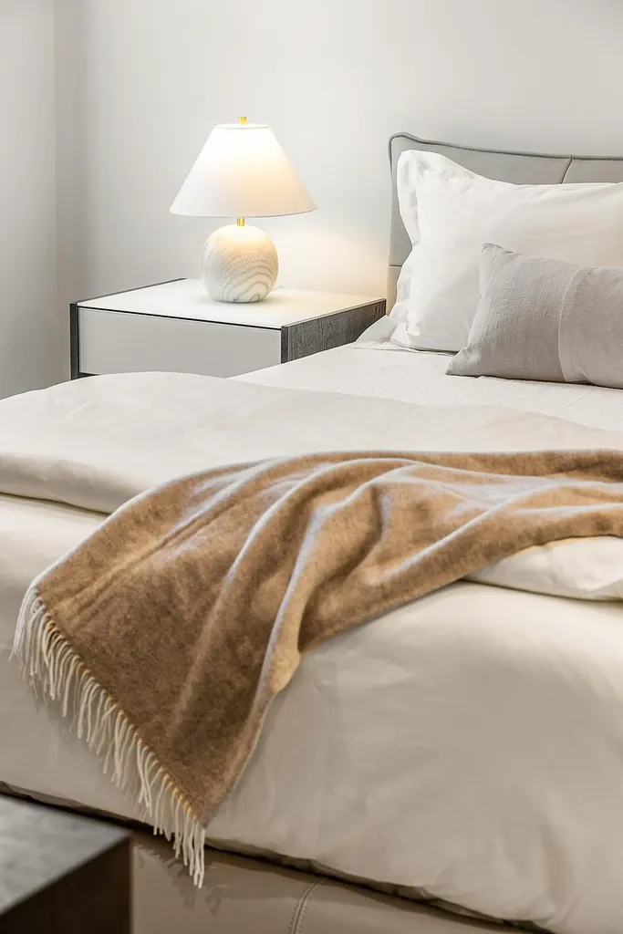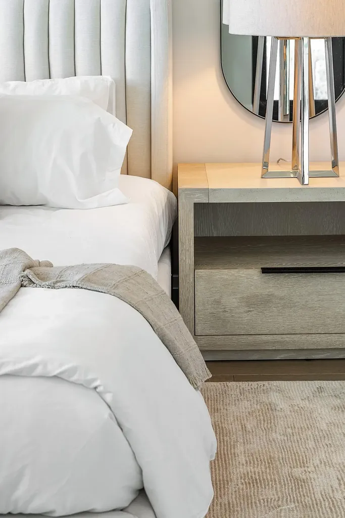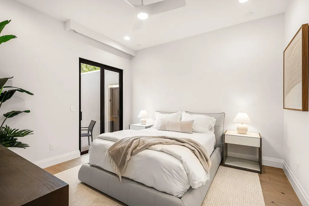 In the primary suite, serenity prevails. Gorgeous lake views spill into the space with custom closets soaring to the ceiling, and automated premium blackout shades to create an atmosphere of indulgent privacy. The bathroom feels like a boutique spa- anchored by a freestanding soaking tub, precise Kohler fixtures, a rain shower, and refined, modern vanities with the highest-level glossed cabinetry illuminated by soft, architectural light.
