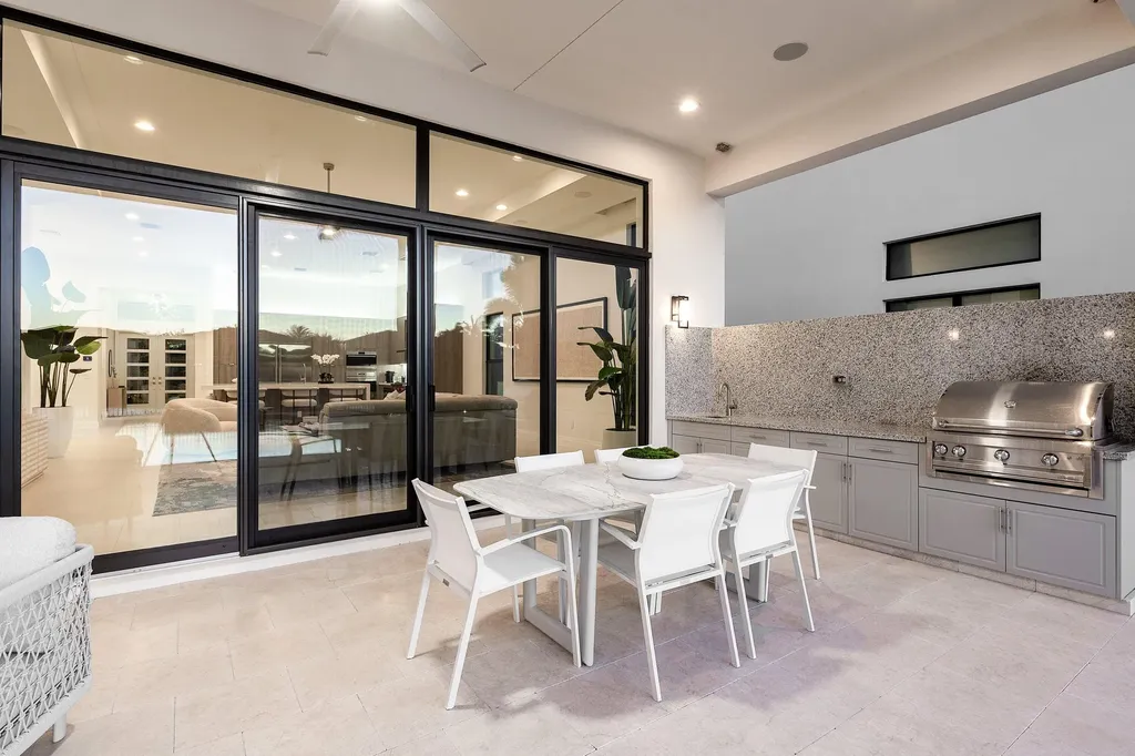 Beyond the glass, a private resort awaits. The upgraded custom pool and reverse edge spa stretch across a Pearl Blanco marble deck, and the covered patio becomes a true extension of the home, complimented by a fully equipped summer kitchen. The expansive long lake views create a serene backdrop with endless open vistas.