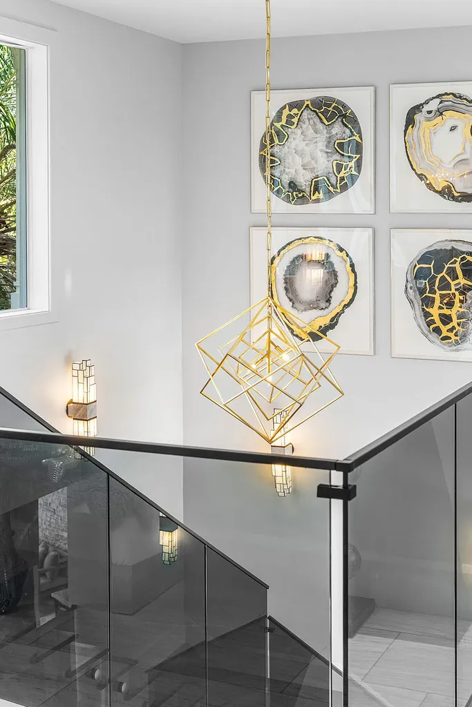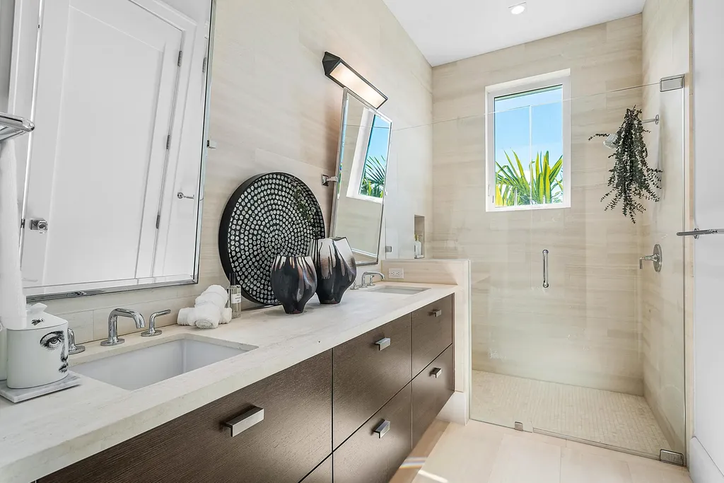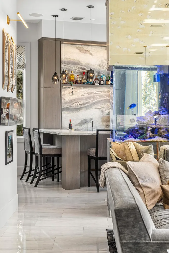 The first level is thoughtfully designed for both entertaining and everyday living, offering a private theater room with five TVs and centralized control, a versatile club room (plumbed for easy conversion to a secondary suite), a refined office with custom floor-to-ceiling built-ins, and a striking powder room adorned with panda marble. A full wet bar with leathered marble countertops, wine refrigeration, custom aquarium, and a cabana bath with secondary laundry complete the space, along with seamless indoor-outdoor connectivity.