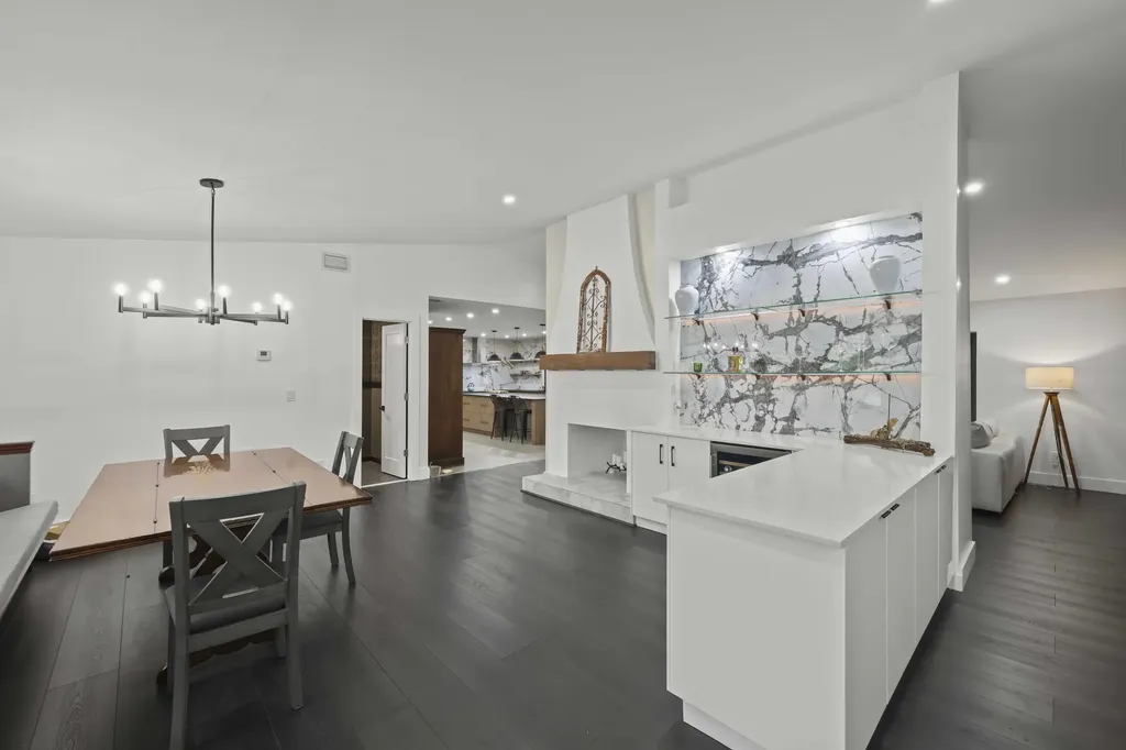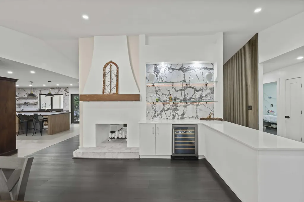 The main living area features vaulted ceilings, a wood-burning fireplace, luxury vinyl flooring, and custom wall paneling that adds warmth and architectural interest. Just off the entry, a stylish bar area with quartz countertops, porcelain backsplash, and a wine refrigerator creates a welcoming space for hosting and gathering.