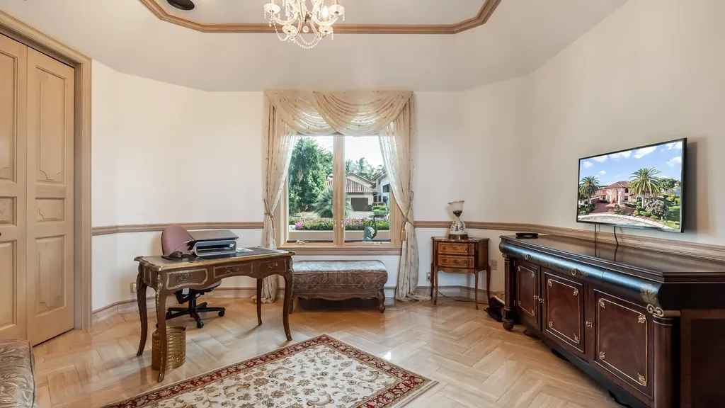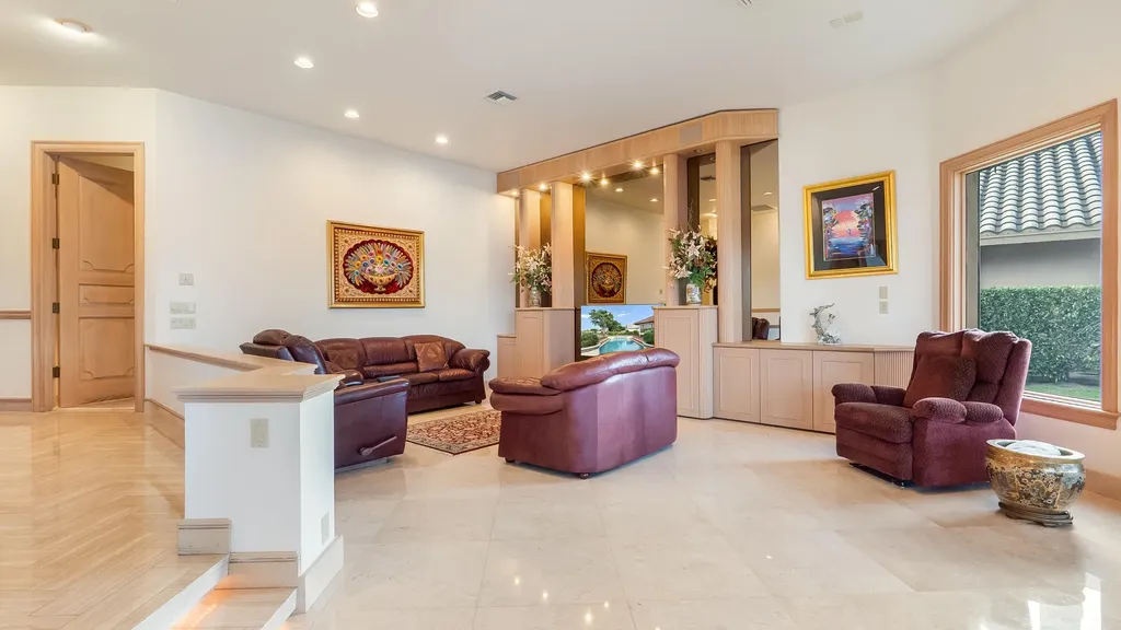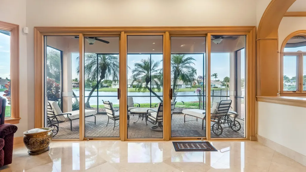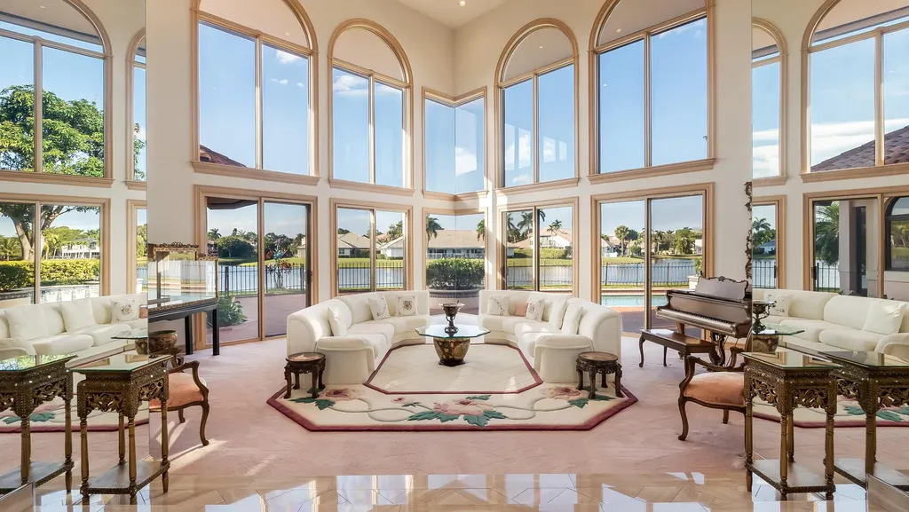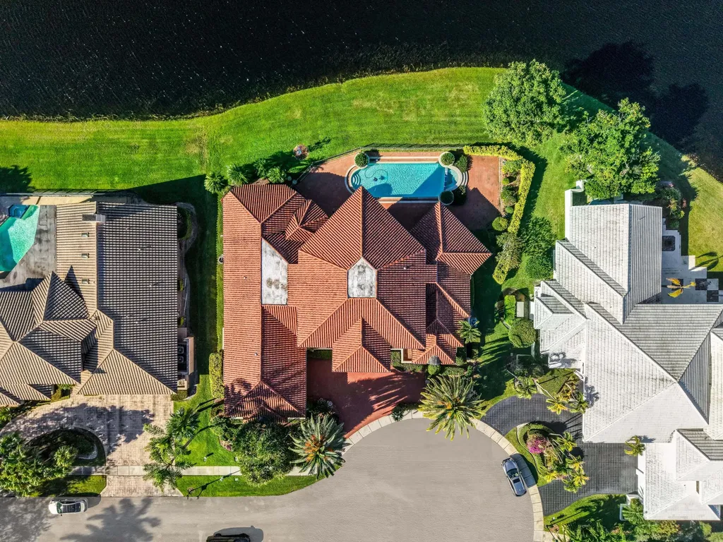 A truly rare offering within Woodfield Hunt Club, this exceptional lakefront residence with spectacular water views from every room presents an almost unheard-of opportunity to own nearly half an acre, perfectly positioned on a quiet cul-de-sac in one of Boca Raton's most exclusive boutique communities. Known for its custom homes, privacy, and timeless elegance, Woodfield Hunt Club offers optional membership to the prestigious Woodfield Country Club and its world-class amenities. The residence blends scale, sophistication, and architectural presence. The grand interior is introduced by striking herringbone-pattern marble floors and a dramatic spiral staircase, setting the tone for refined living. Expansive living and family rooms are designed for both elegant entertaining and everyday comfort, flowing effortlessly to the screened-in patio and overlooking the heated pool and spa with serene lake views.