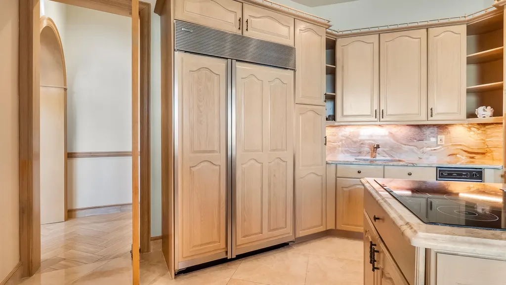 The chef's kitchen is well-appointed with granite countertops, a breakfast area, a Sub-Zero refrigerator, and premium Thermador appliances. The primary suite, conveniently located on the main level, offers a private retreat with dual walk-in closets, dual sinks, marble finishes, and a separate soaking tub and shower. 3 additional first floor bedrooms and full baths provide ideal flexibility for family, guests or multigenerational living.