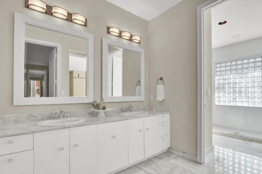 The primary suite serves as a private retreat, featuring high ceilings, peaceful views of the pool and garden, and a comfortable sitting area within the suite. Two walk-in closets offer ample storage, while the renovated primary bathroom is beautifully appointed with a separate shower and a freestanding soaking tub, creating a spa-like experience. All four bedrooms are thoughtfully arranged on one wing of the home to preserve privacy, with generously sized rooms throughout. One additional bedroom includes a large walk-in closet, and all four full bathrooms are seamlessly integrated into the home's layout.
