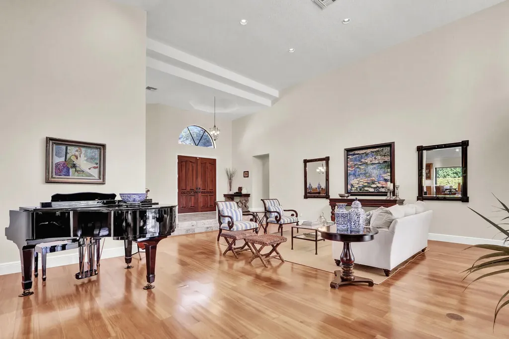 A gracious foyer sets the tone upon arrival, immediately drawing the eye straight through the home to sweeping views of the expansive backyard and the golf course beyond. The main living room is truly grand in scale, highlighted by dramatic 20-foot ceilings that impress while remaining warm and inviting. Adjacent to this space, the family room offers a more relaxed setting ideal for everyday living. Just off the foyer, the formal dining room comfortably accommodates seating for ten or more, making it perfect for holidays, celebrations, and elegant dinner parties. Together, these spaces create an open, balanced interior that functions beautifully for both entertaining and daily life.